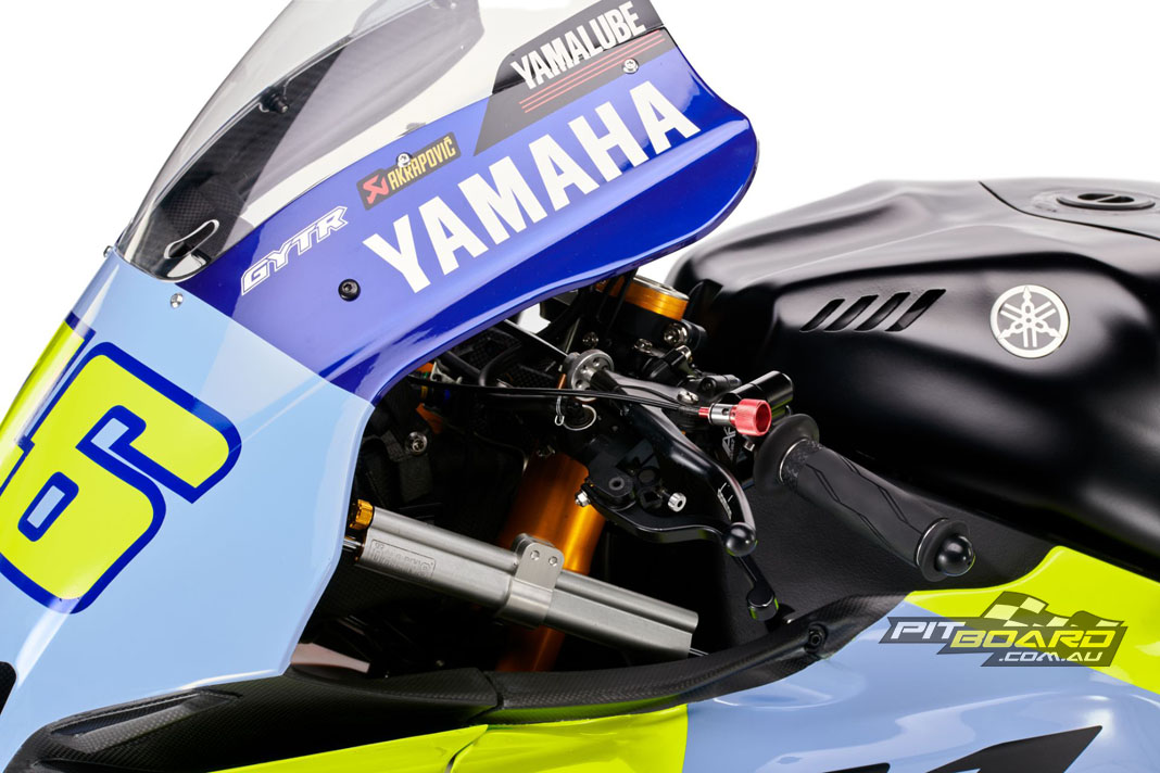 The R1 GYTR VR46 Tribute was given to Valentino Rossi for the One More Lap event at EICMA 2021, which the Italian star attended for the first time, as Yamaha pay tribute to VR46 and his historic legacy. The R1 GYTR VR46 Tribute was built with carefully selected parts which, among others, include the following: