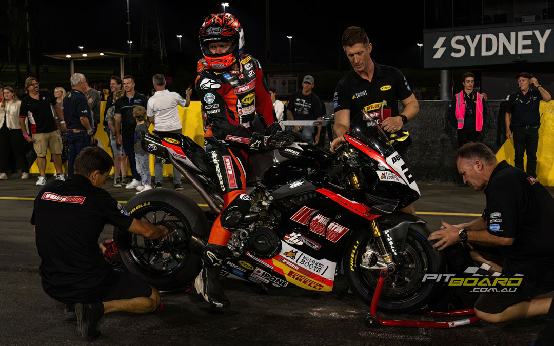 The second most important non-racing session of the weekend kicked off at 8:30pm in both darkness and bright artificial light, with the top 12 set to go through to Qualifying 2. Josh Soderland didn’t even complete a lap on his Ducati before getting black-flagged for not having a red taillight.