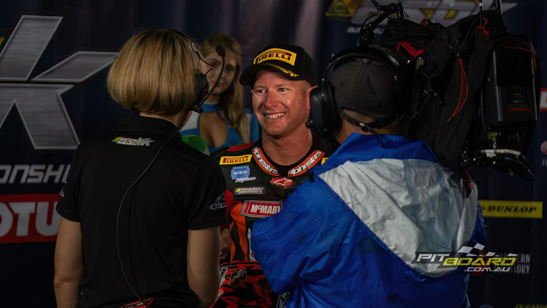 At the finish, it was the dominant shape of the McMartin Ducati Panigale V4R with Josh Waters aboard taking an easy win by 6.3 seconds (he gave them a few seconds on the last lap) from Troy Herfoss, Cru Halliday, Arthur Sissis and Glenn Allerton in fifth.