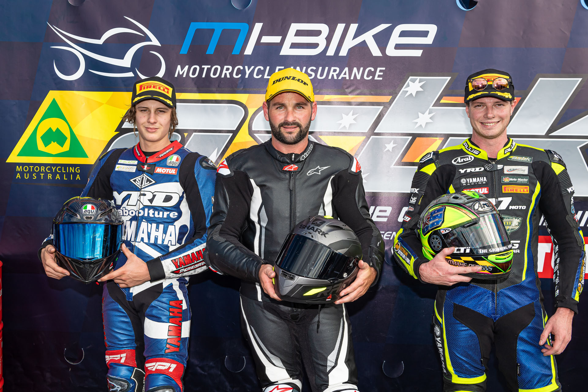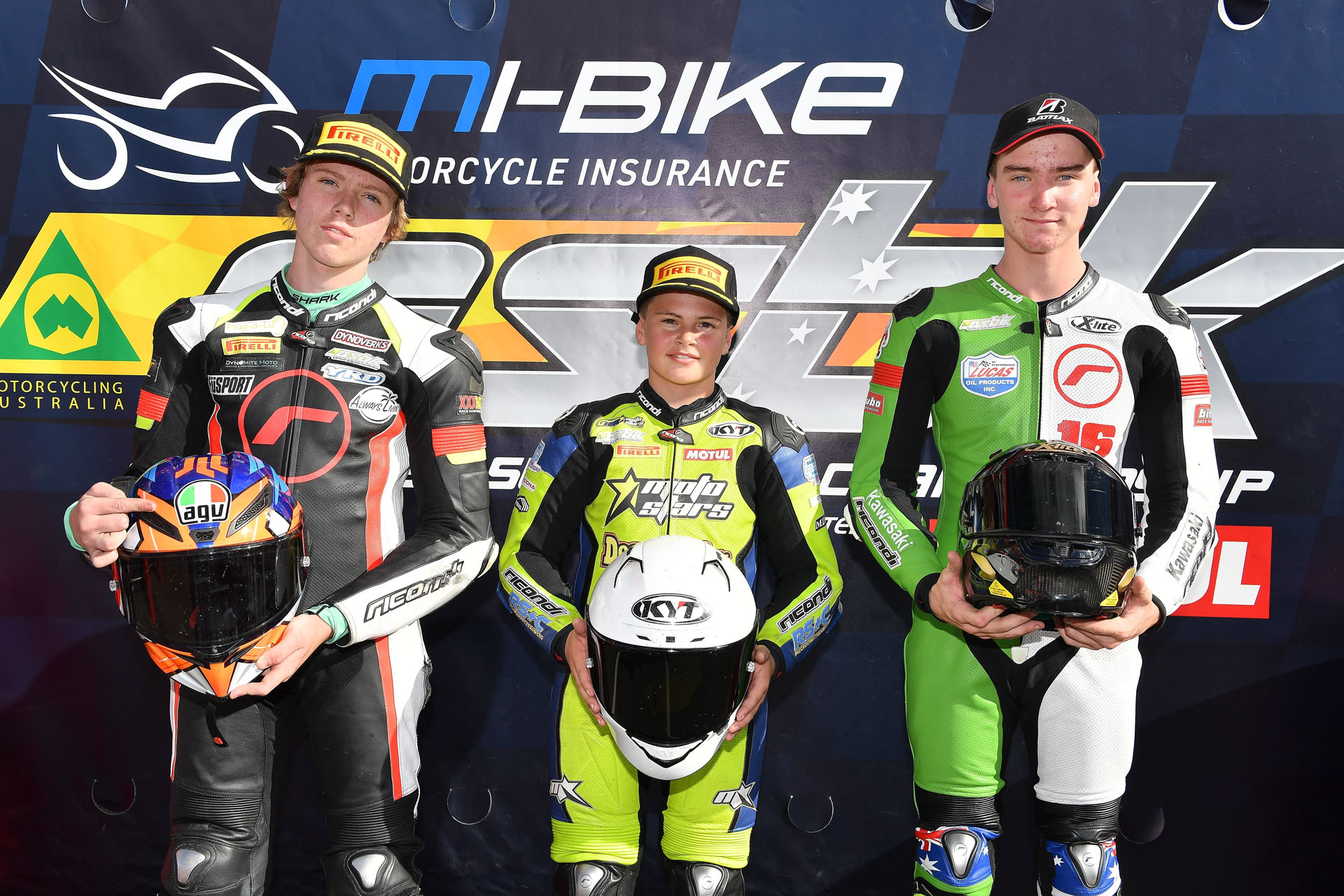 In qualifying, it was again Cameron Dunker who put his Yamaha R3 onto the pole with a time of 1:05.070 from Cameron Swain (1:05.695) with Hayden Nelson (1:05.763) rounding out the front row.