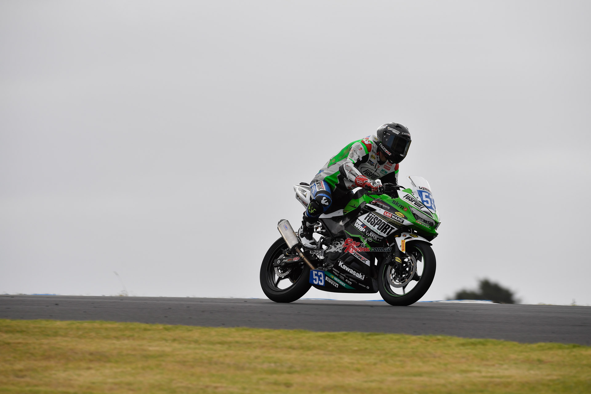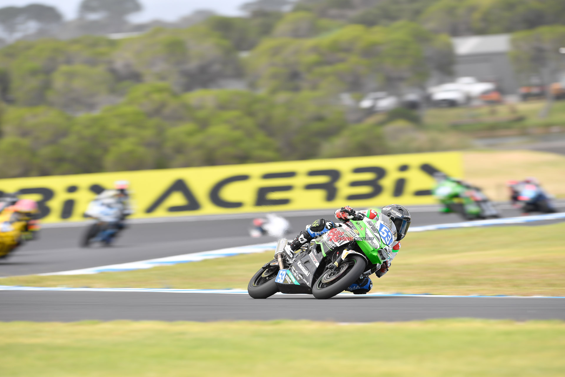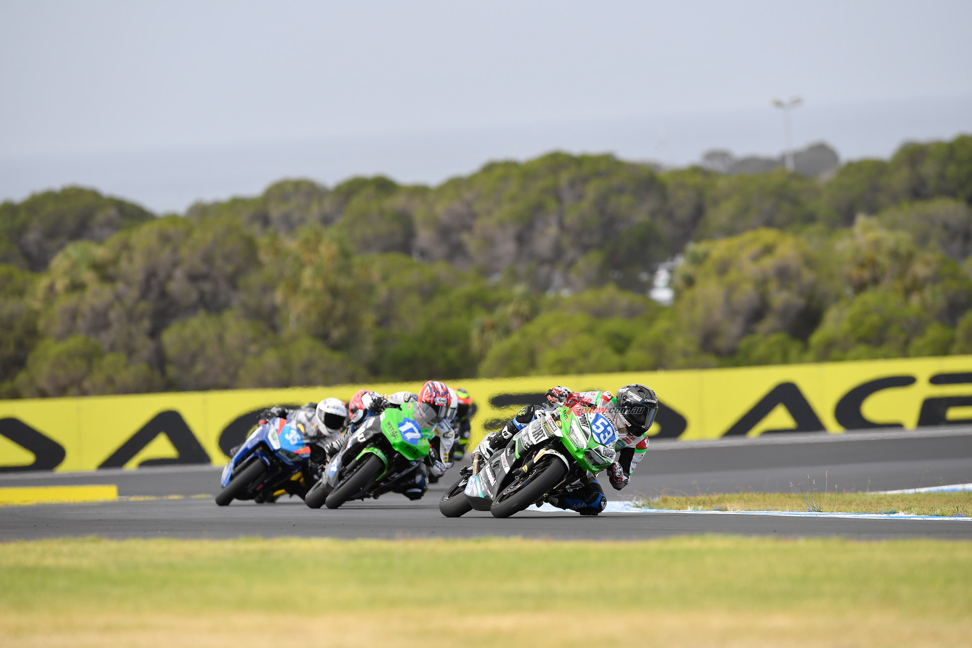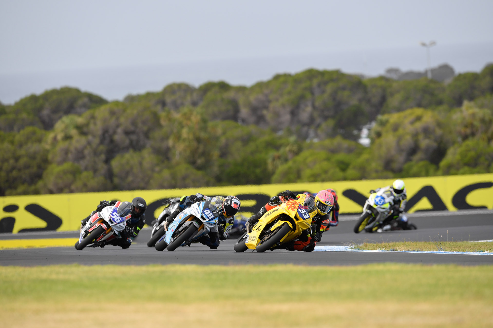 Ryan Larkin (Yamaha) put in a stirring final lap to finish third, just 0.03 seconds behind Newman. Mitch Simpson (Yamaha), Tara Morrison (Kawasaki), Valentino Knezovic (Yamaha), Harrison Watts (Kawasaki) and Ryder Gilbert (Yamaha) all flashed across the line in rapid succession to fill positions 3-8 in the eight-lapper. Gilbert again set the fastest lap of the race, today’s 1:47.348 set in ideal conditions. The current lap record for Supersport 300 is of the oldest benchmarks at Phillip Island – Luke Jhonston’s 1:47.187 set in 2020.