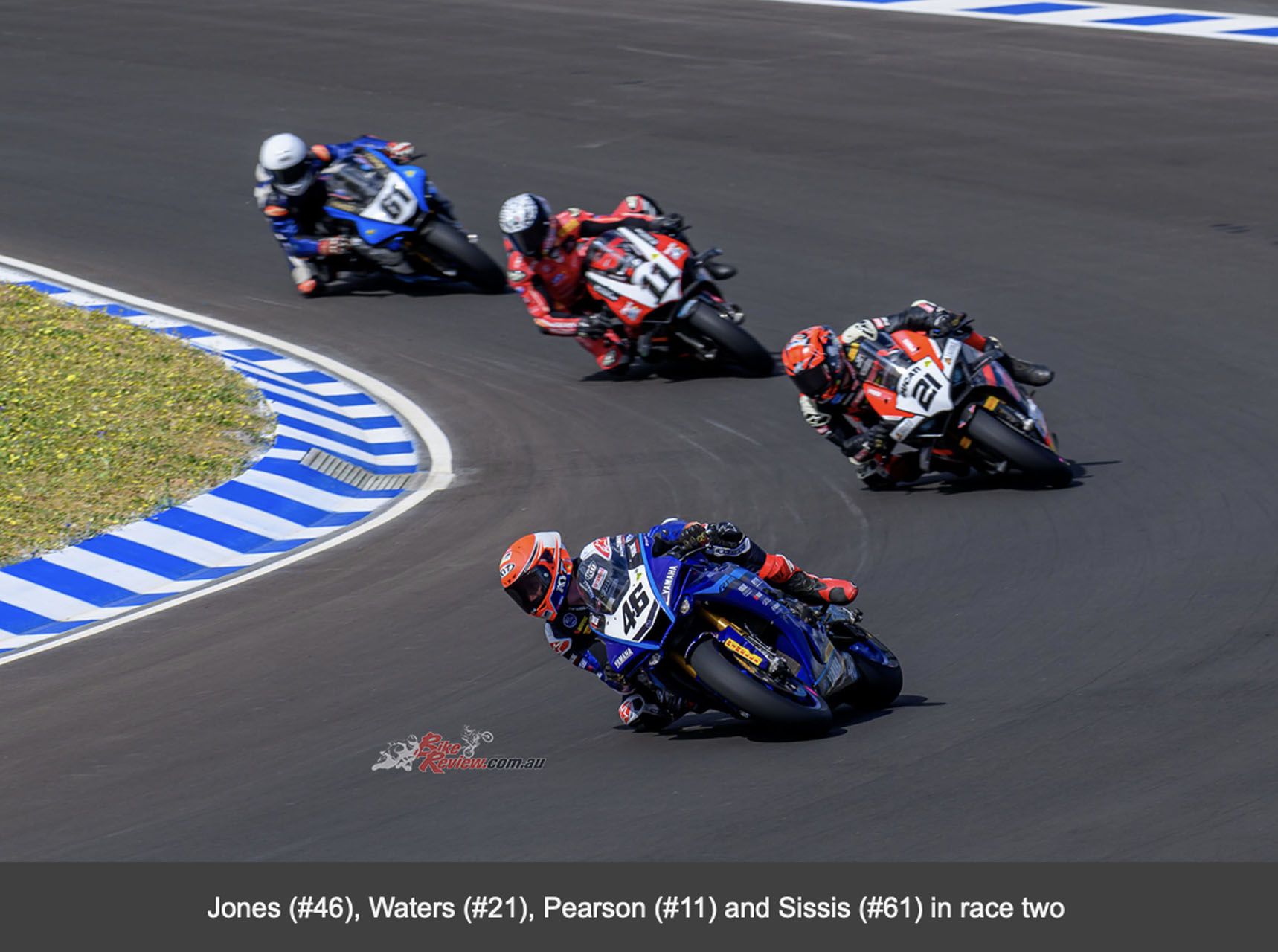 Pearson finished ahead of a fast Anthony West (Addicted to Track Yamaha), as rookie teenager Cameron Dunker (Penrite Racing Yamaha) banked his first Superbike podium with a brilliant last-lap pass on teammate Max Stauffer. Waters was fifth, followed by Sissis, John Lytras (Yamaha) and a lacklustre Jones who had started from pole position.
