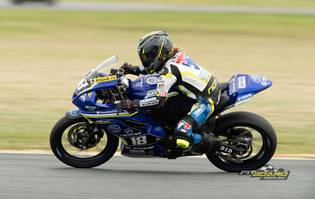 It was an unusually subdued and cautious bLU cRU Oceania Junior Cup field that made its way to the start line for their first race of the Sunday. A mist/light rain had descended upon the Wakefield circuit and as the riders gridded up on slick tyres the field, families, fans and officials all looked skyward for answers. Mercifully the track was warm enough to dry the rain before it had a chance to cause carnage. From the get-go, most of the riders rode with care, maturity and the sort of mindfulness that Garry McCoy has been teaching all season.