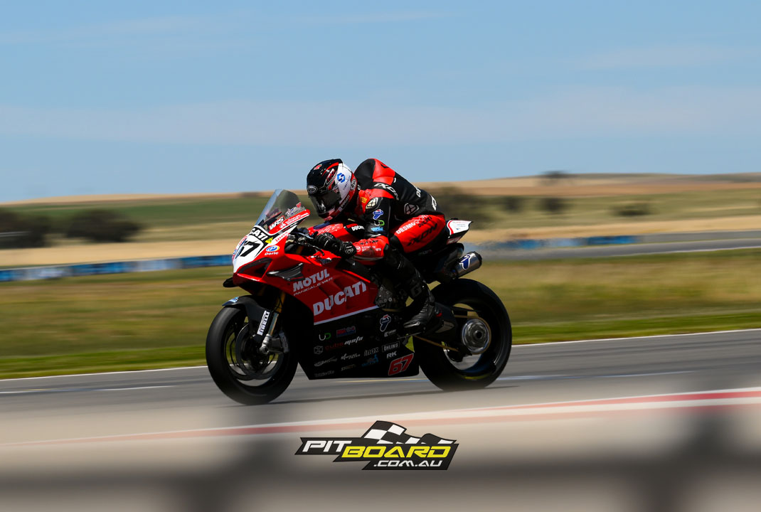 Up front, the sentimental local favourite Arthur Sissis was doing his best work of the season with Herfoss for company. Waters was up to third, Maxwell fourth while Glenn Allerton found himself down in fifth. Maxwell had an easy pass on teammate Waters, but for those who thought there were team orders, Waters nearly repassed the #1 Ducati shortly after. he would later reveal it was just due to a hot tow down the straight from his teammate.
