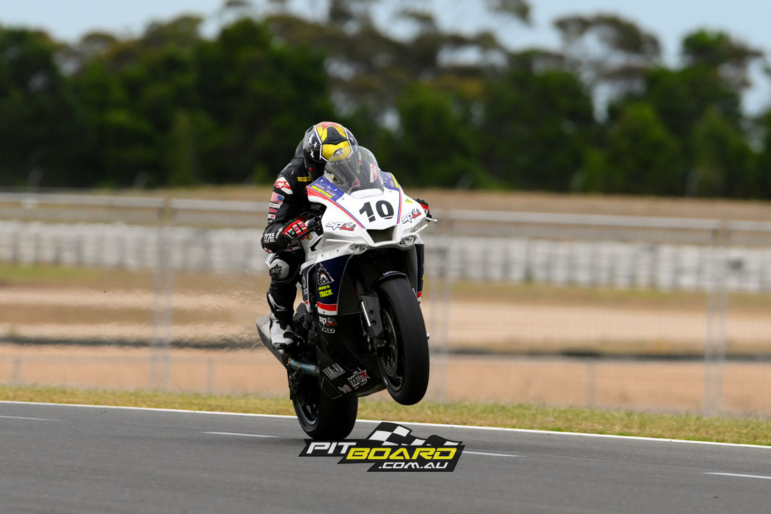Fellow Thriller Motorsport rider Josh Hook and Marcel Shrötter were not unreasonably down in the mid-teens for the session, along with Moto3 regular Joel Kelso having his first hit out on a Superbike. Troy Herfoss was fastest for the session with a late fast lap of 1:51.737, narrowing the gap to the lap record of 1:50.972 and pole record of 1:50.520. It was very solid for a first practice.