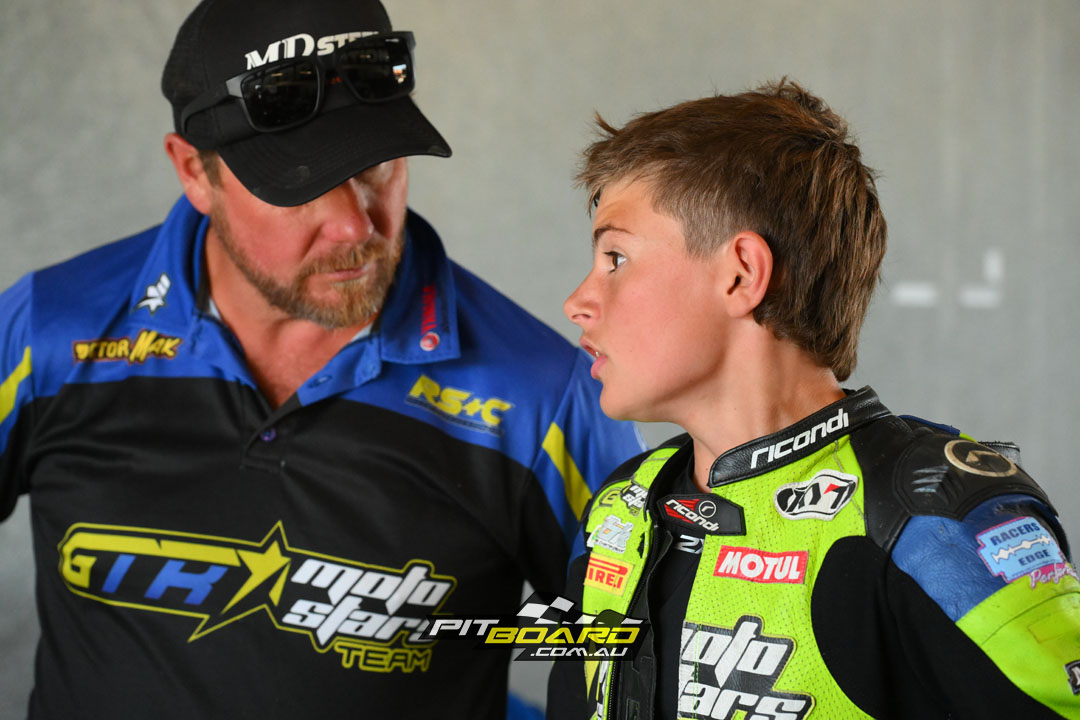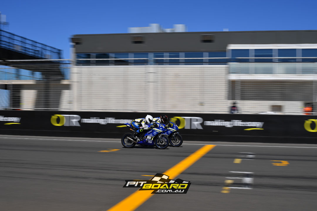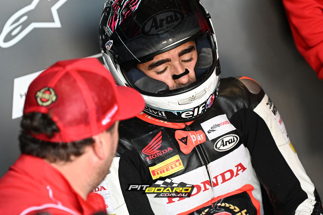 Tom Bramich made life difficult for himself and his team, crashing halfway through the session. Passfield also went down. Dallas Skeer was able to work his way to second, surprising even himself while a somewhat fortunate Bramich was third, the clearly injured Ty Lynch fourth and Scott Nicholson fifth. Championship leader John Lytras was back in eighth, but that spot still comfortably delivers the championship if replicated in the race.