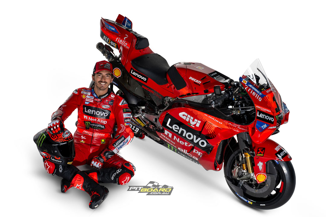 Reigning World Champion Francesco “Pecco” Bagnaia is geared up to defend his Title as he proudly displays the number 1 on the fairing of his Desmosedici GP. Bagnaia will again be partnered with compatriot Enea Bastianini, who is entering his second year with the factory team. In the Superbike category, Alvaro Bautista’s Panigale V4 R, adorned with the number 1, will be accompanied by the Ducati featuring the number 11 of reigning Supersport World Champion Nicolò Bulega, who is making his debut in the category.