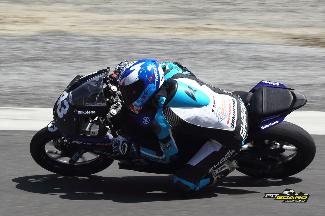 We lined up between Team Shark Silkoline and Team Shark Leathers, we agreed that Luca should do the first stint since he was faster and try to gain a gap. Unfortunately, the other two teams on the front row had the same idea, so Luca was battling with Keo Watson and ASBK Supersport 600 rider, Mitch Khune for the first half hour! The flag drops and Luca gets an awesome start, overtaking Keo into turn one. This was short lived as Keo instantly fought back and took control of the race within the opening minutes. We started to lose some ground on Shark Silkoline as Luca had already caught up to some lap-down traffic within the first half hour stint!