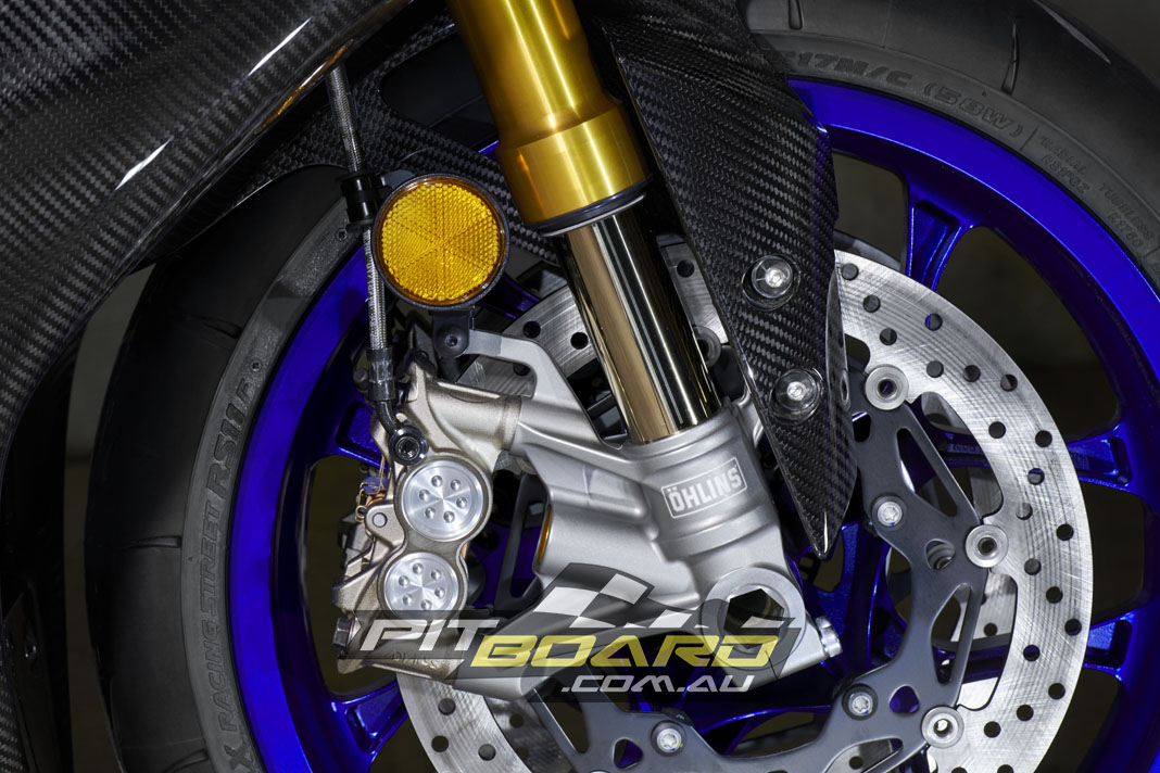 - Öhlins ERS NPX front fork with integrated gas cylinder and optimised rear shock settings (R1M)