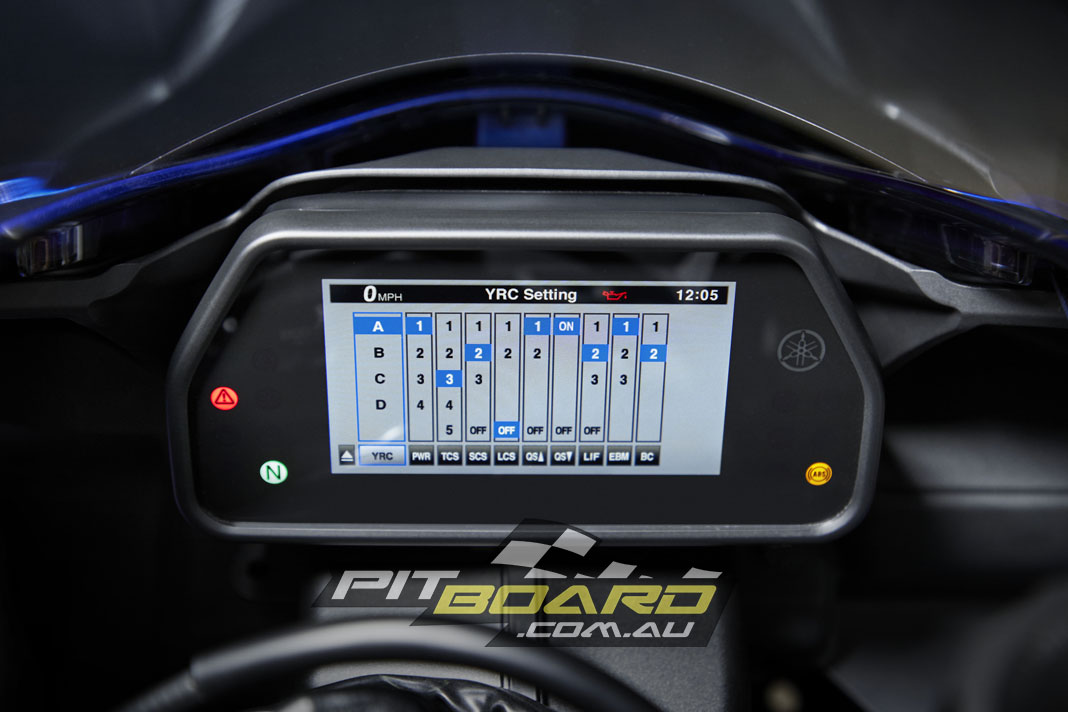 Engine: Liquid-cooled, four-stroke, crossplane forward-inclined parallel four-cylinder, four-valve per cylinder, DOHC, 79 x 50.8mm bore x stroke, 998cc, 13.0:1 compression, banking sensitive TCS/SCS, LIF, LCS, QSS, PWR power modes, YCC-I, YCC-T, six-axis IMU, (CCU), magnesium oil pan, titanium four-into-two-into-one exhaust