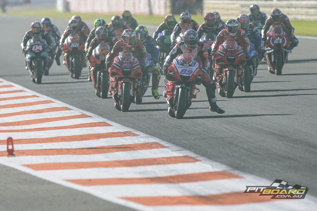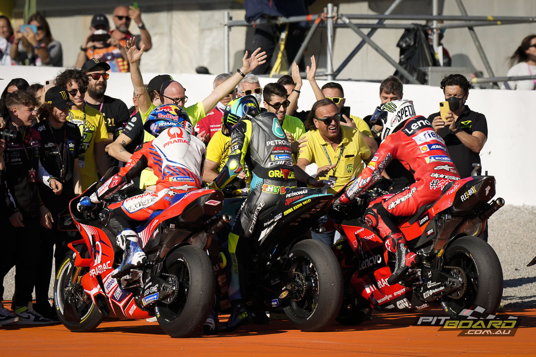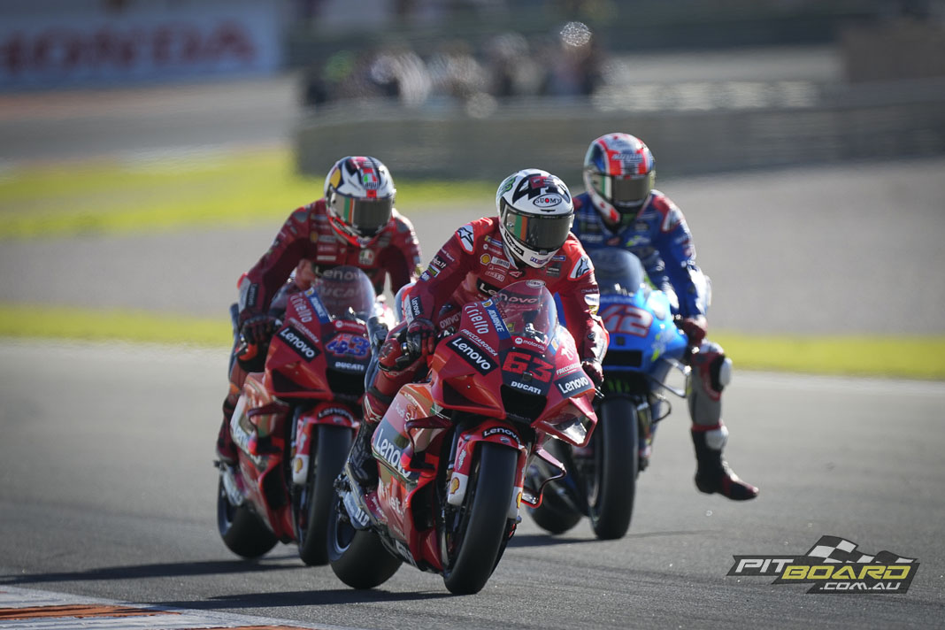 Francesco Bagnaia (Ducati Lenovo Team) took victory as the Italian led home a historic Ducati 1-2-3 at the Gran Premio Motul de la Comunitat Valenciana, he once again perfectly-poised as he saw the flag just ahead of Jorge Martin (Pramac Racing) and Jack Miller (Ducati Lenovo Team) for a Bologna lockout.