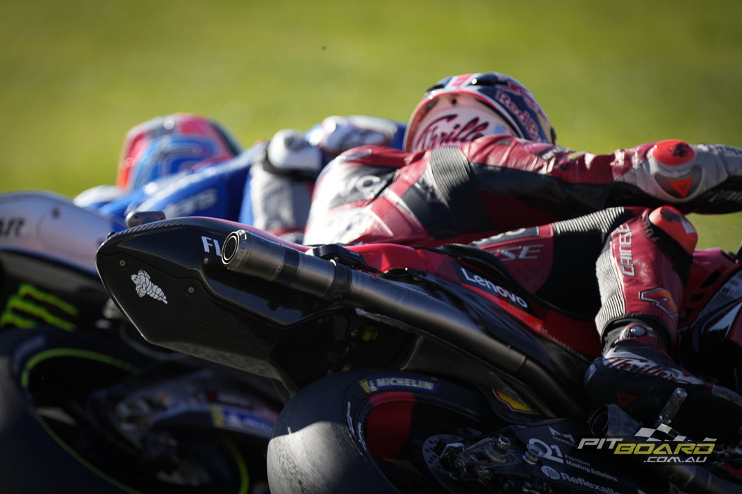Acosta attacked at Turn 1, and Foggia lined him up to return the favour at Turn 2. But the Leopard rider was in too deep and there was contact between the two, with the newly-crowned World Champion then unable to hold it and skidding off into the gravel. Rider ok and Foggia continued, but the incident was under investigation by the Stewards.