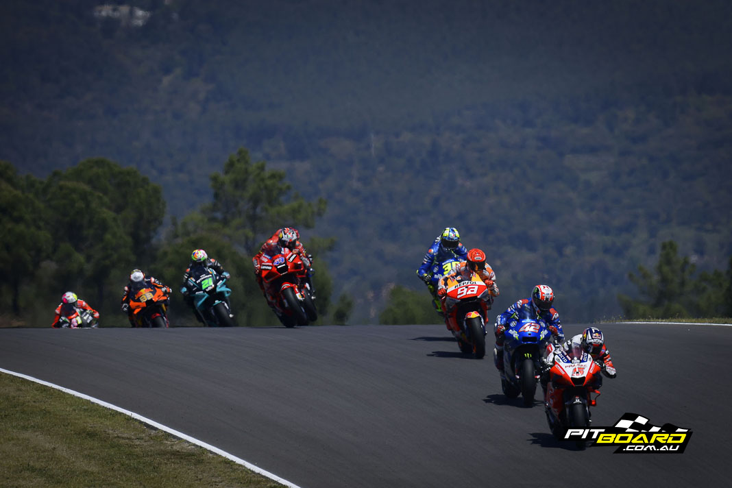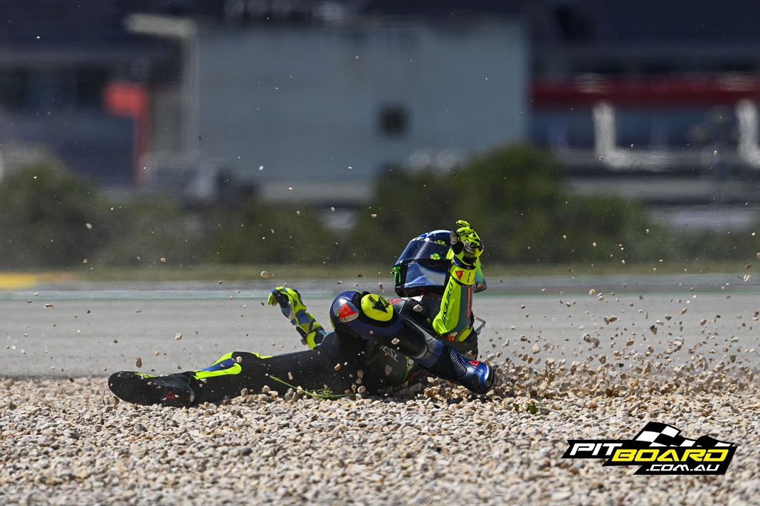 Lap 3 saw Quartararo make a clean move up the inside of Mir at Turn 1 for P3, the Frenchman making swift progress after getting a bit beaten up at the start. A Turn 13 move on Zarco stuck at the third time of asking a lap later. By Lap 5, Rins was now the race leader, but Zarco blasted back through on the straight. Then, suddenly, the sound of a bike hitting the deck was heard and as the cameras panned out, we saw Miller down at Turn 3 at the beginning of Lap 6. The Australian’s Portuguese GP was over after just over four laps, a disaster for the factory Ducati man. On the same lap, Miguel Oliveira’s (Red Bull KTM Factory Racing) hopes of another dream home round rostrum were also over as the Portuguese star was down at Turn 14. He remounted but it was game over for Oliveira.