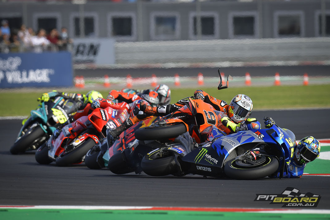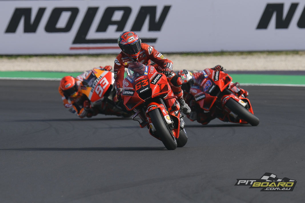 After only a couple of laps, there was a breakaway trio of Pecco, Miller and Marc Marquez, and some drama elsewhere: former reigning Champion Joan Mir (Team Suzuki Ecstar) jumped the start and was given the requisite Double Long Lap, but then the number 36 was out anyway, coming together with Danilo Petrucci (Tech3 KTM Factory Racing). No further action was taken, although it was investigated.