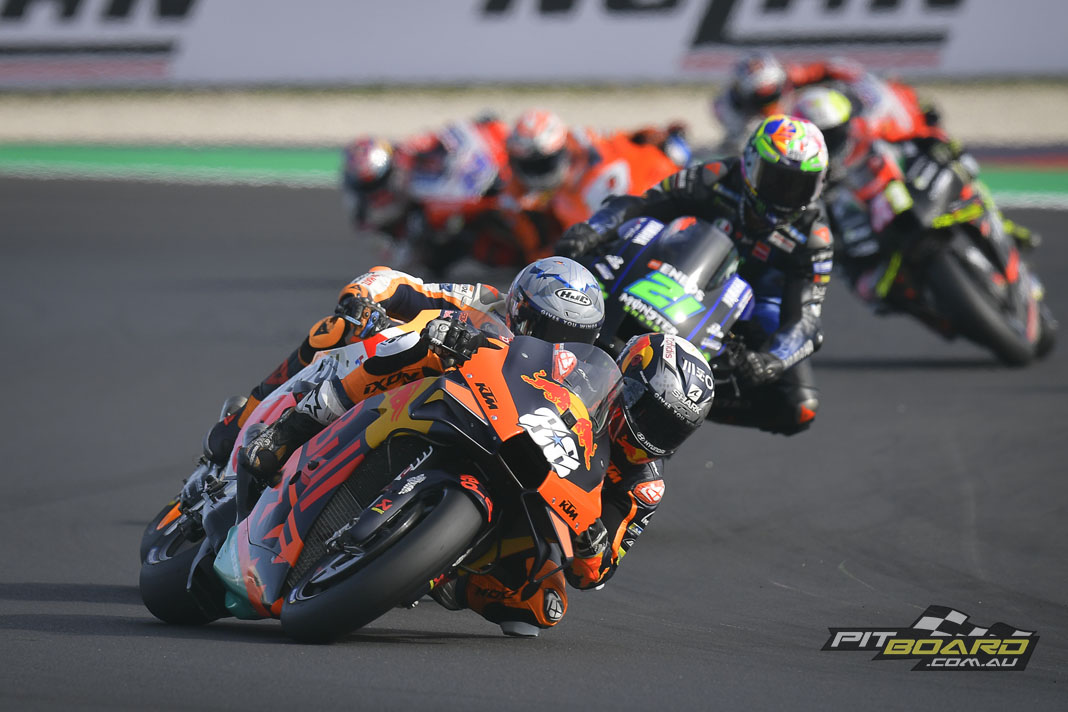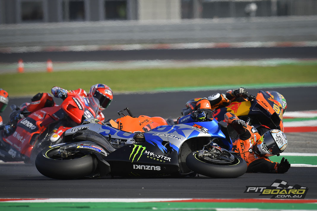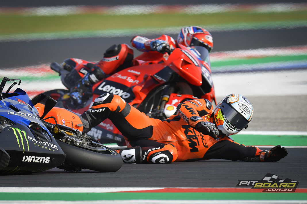The Bagnaia-Miller-Marquez train had almost a couple of seconds in hand by then, but Miller was starting to come under some serious pressure from Marquez. And then, even more drama – Miller crashed out. Rider ok but leaving his teammate in the lead and Marquez on the charge behind him – with Pol Espargaro in third with company from Oliveira, Franco Morbidelli (Monster Energy Yamaha MotoGP) and Aleix Espargaro (Aprilia Racing Team Gresini).