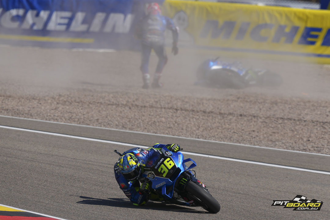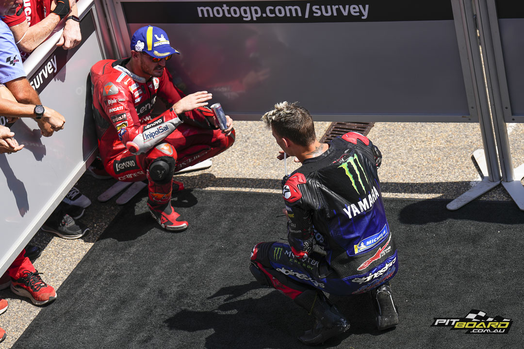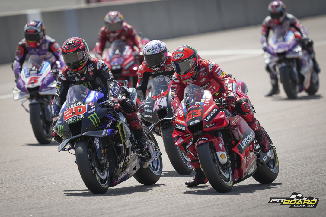 Quartararo nabbed the holeshot from Bagnaia, and the number 63 got tucked in on the chase. He briefly took over at the start of Lap 2 but El Diablo hit back, and not long after disaster struck for Pecco, the rear sliding out on Lap 4. From that point on, Quartararo had the hammer down.