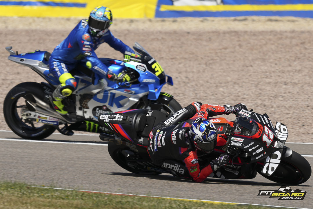 After little more than 20 laps, Quartararo had stretched his margin over Zarco to more than three seconds. His fellow Frenchman enjoyed a similar gap over Aleix Espargaro, but Aprilia’s ‘Captain’ was coming under serious attention from Miller. The number 43 fired his Ducati down the inside at Turn 1 on Lap 23 but ran it in too deep, and the result was the same when he tried again on Lap 26. Ironically, Espargaro himself went wide through there on Lap 28 and Miller marched on through into third.
