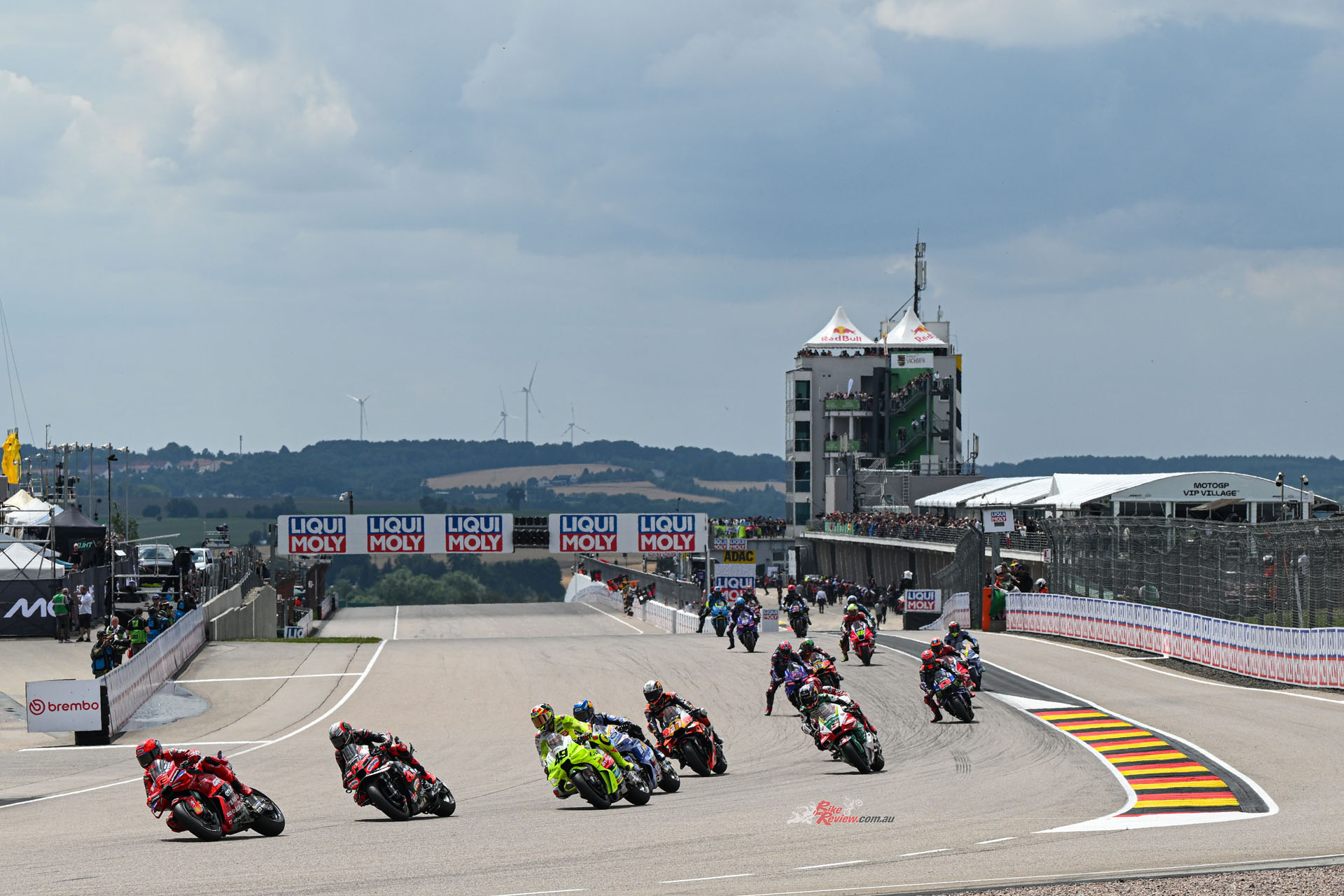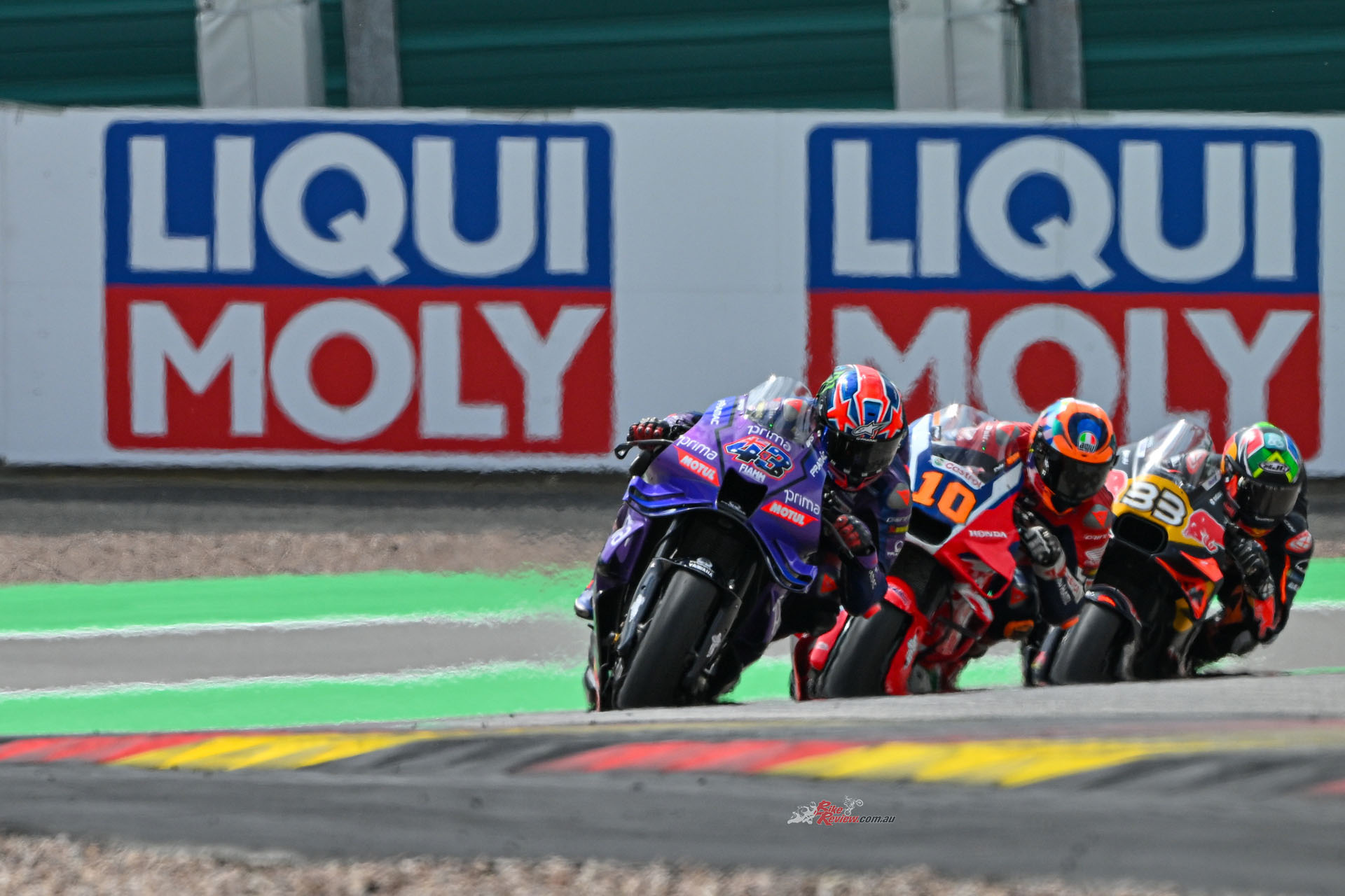 While the threat of wet weather was there, the riders and fans ultimately strapped themselves in for a dry German GP. And as the lights went out, it was Marc Marquez who collected the holeshot, as Fabio Di Giannantonio (Pertamina Enduro VR46 Racing Team) made a blinder from P6 to grab an early P3. Marco Bezzecchi (Aprilia Racing) slotted into P2, as Johann Zarco (CASTROL Honda LCR) slipped to P5 on the opening lap from the middle of the front row.