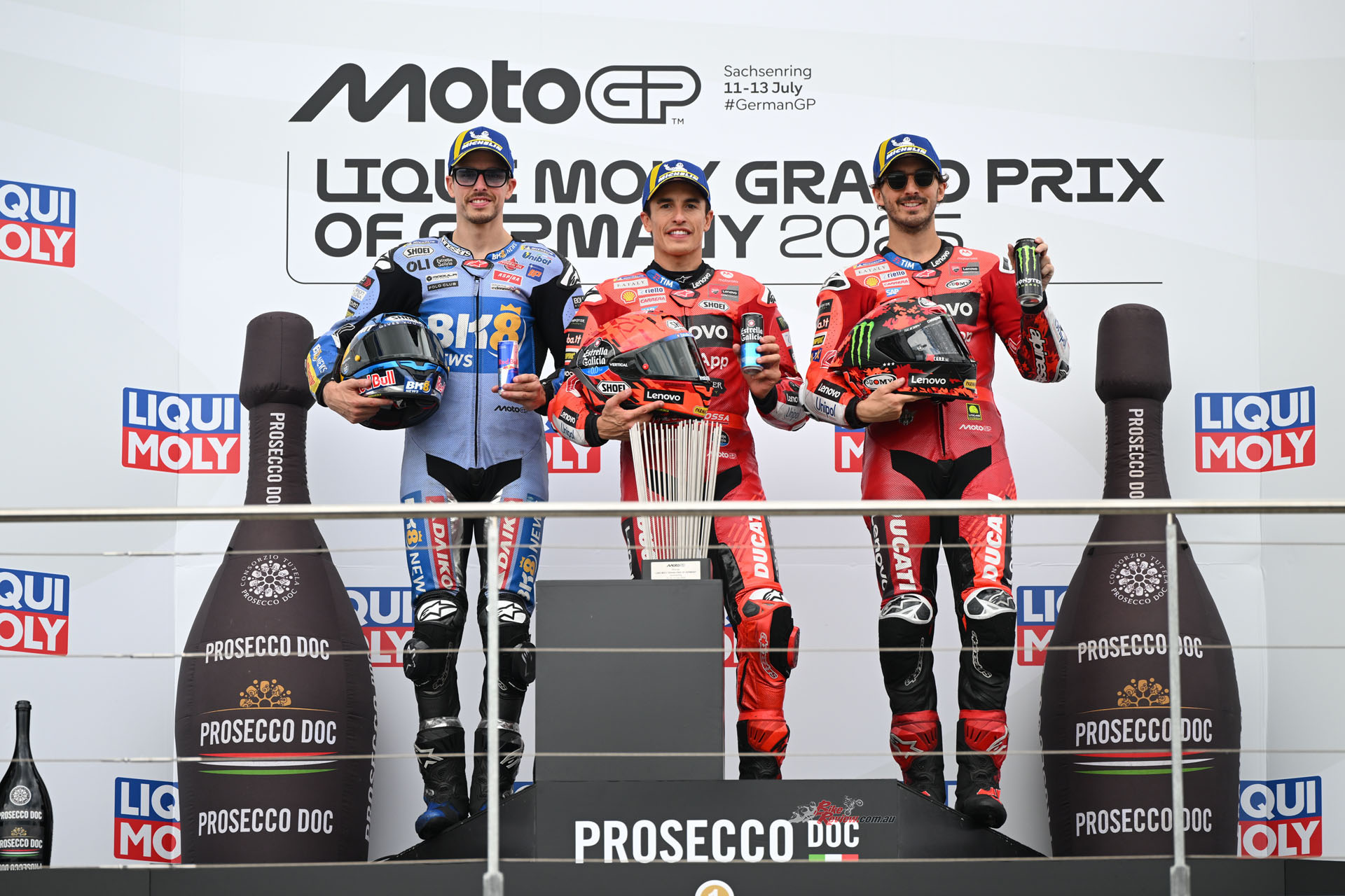 On his 200th start, Marc Marquez (Ducati Lenovo Team) moved into second place on the MotoGP victory tally charts – surpassing legend Giacomo Agostini – in a display of perfection at the Liqui Moly Grand Prix of Germany. It’s 69 wins now for the King of the Sachsenring, as Alex Marquez (BK8 Gresini Racing MotoGP), on his 100th start, strung together an impressive ride to finish P2 while injured. Francesco Bagnaia (Ducati Lenovo Team #63) bounced back with a podium finish in P3 in a battle that saw rostrum contenders crash out at the Sachsenring.