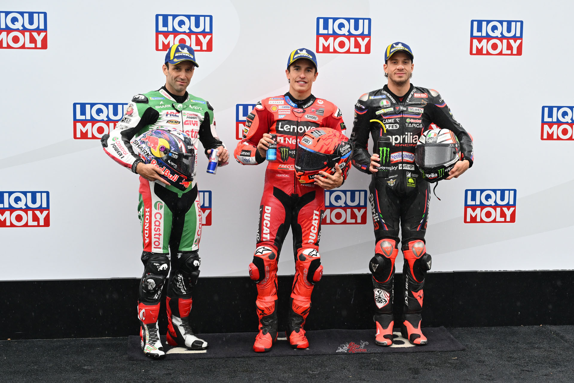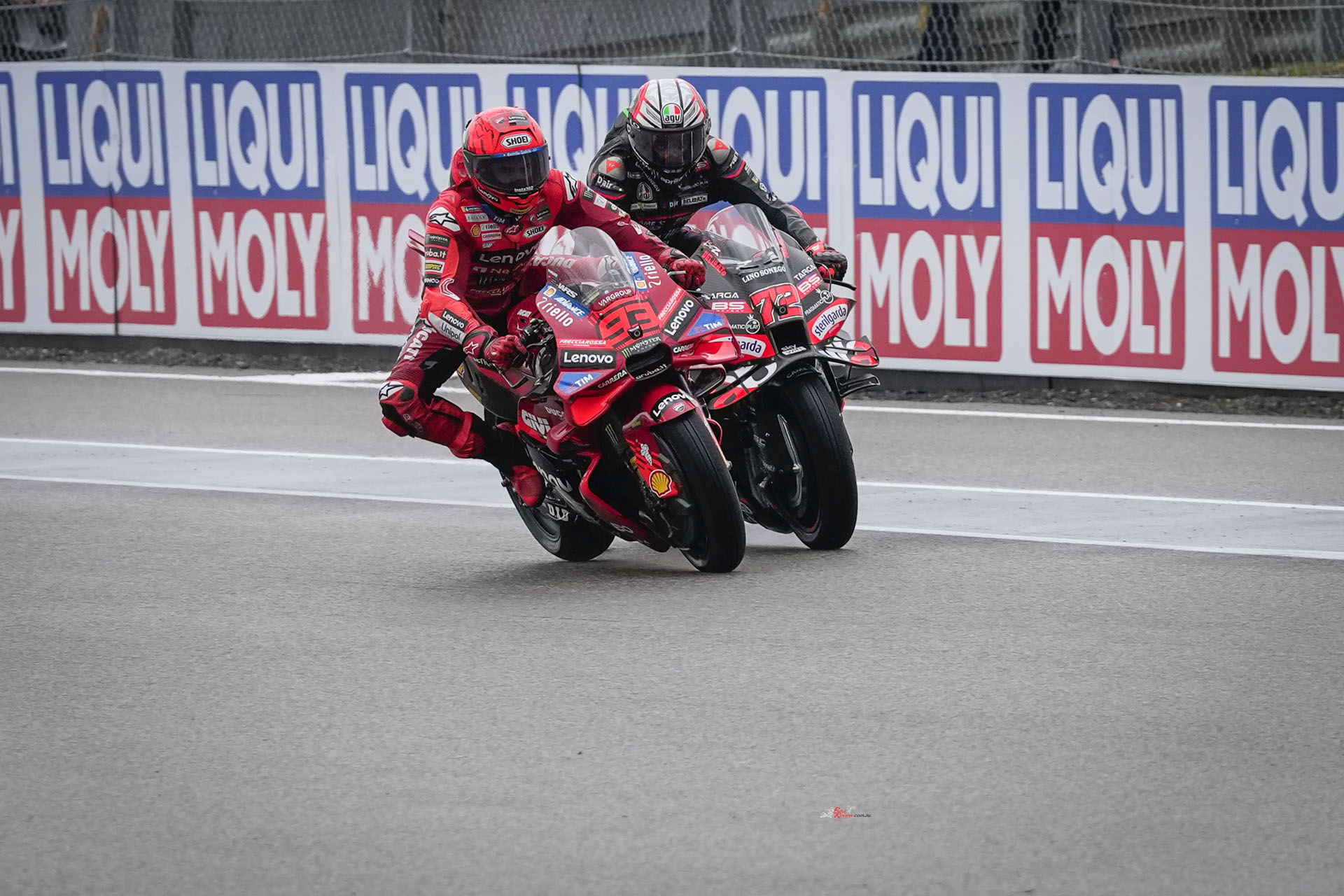 The wet weather had come to play on Saturday at the Liqui Moly Grand Prix of Germany, but that didn’t stop Marc Marquez (Ducati Lenovo Team) from clinching pole position. It was a tight affair, though, as Q1 graduate Johann Zarco (CASTROL Honda LCR #5) pushed the #93 to the wire in a Saturday morning scrap that saw Marquez win by just 0.151s. That meant it was Ducati leading Honda on the front row at the Sachsenring, with Aprilia Racing also there after Marco Bezzecchi’s (Aprilia Racing #72) fine rain dance in Q2.