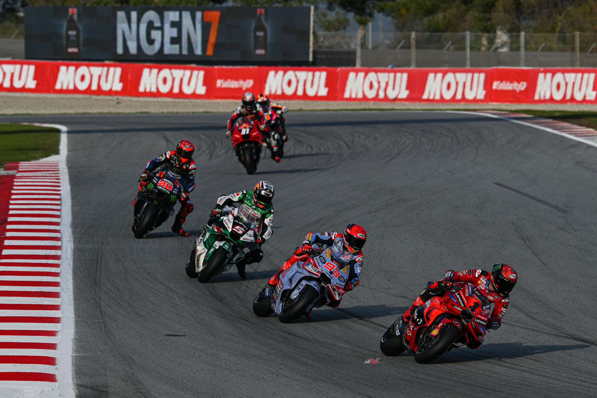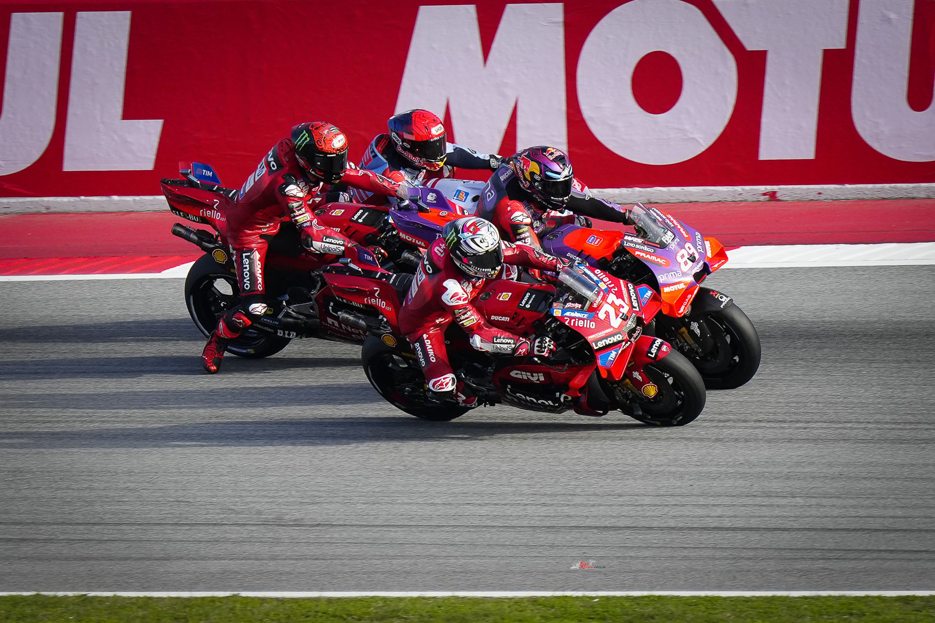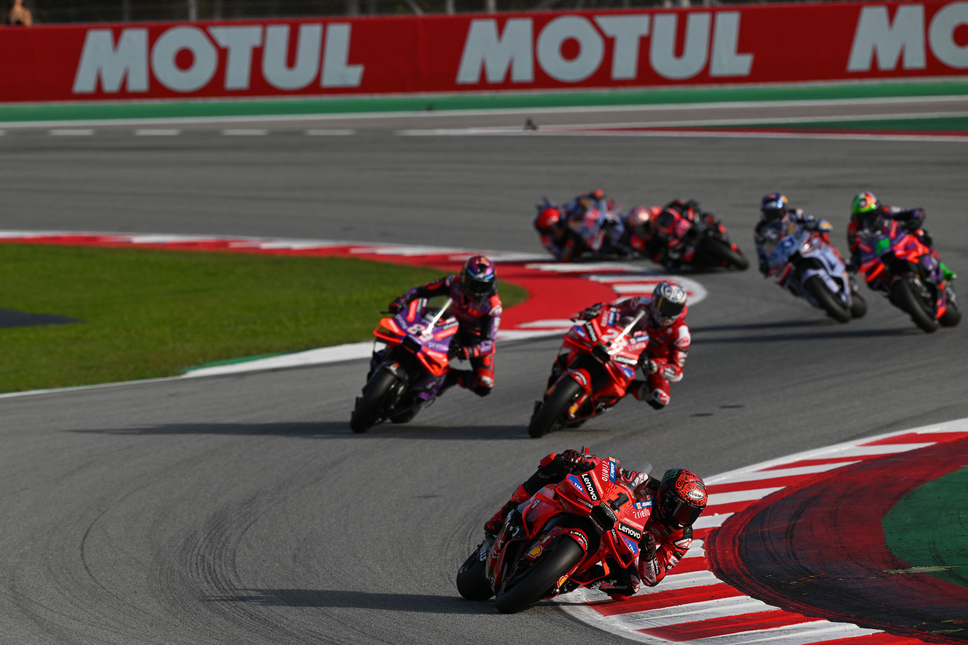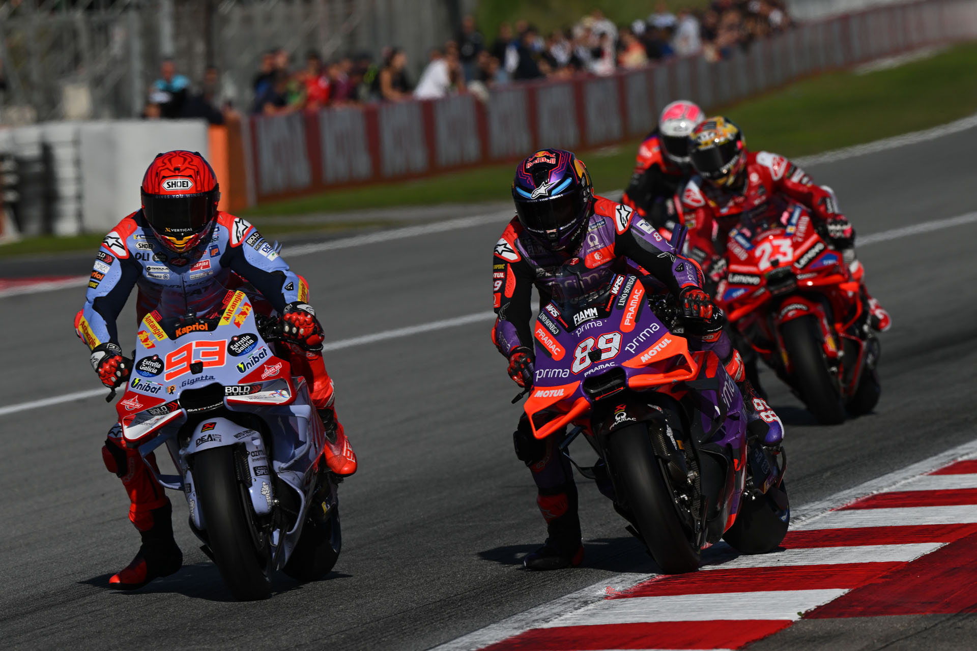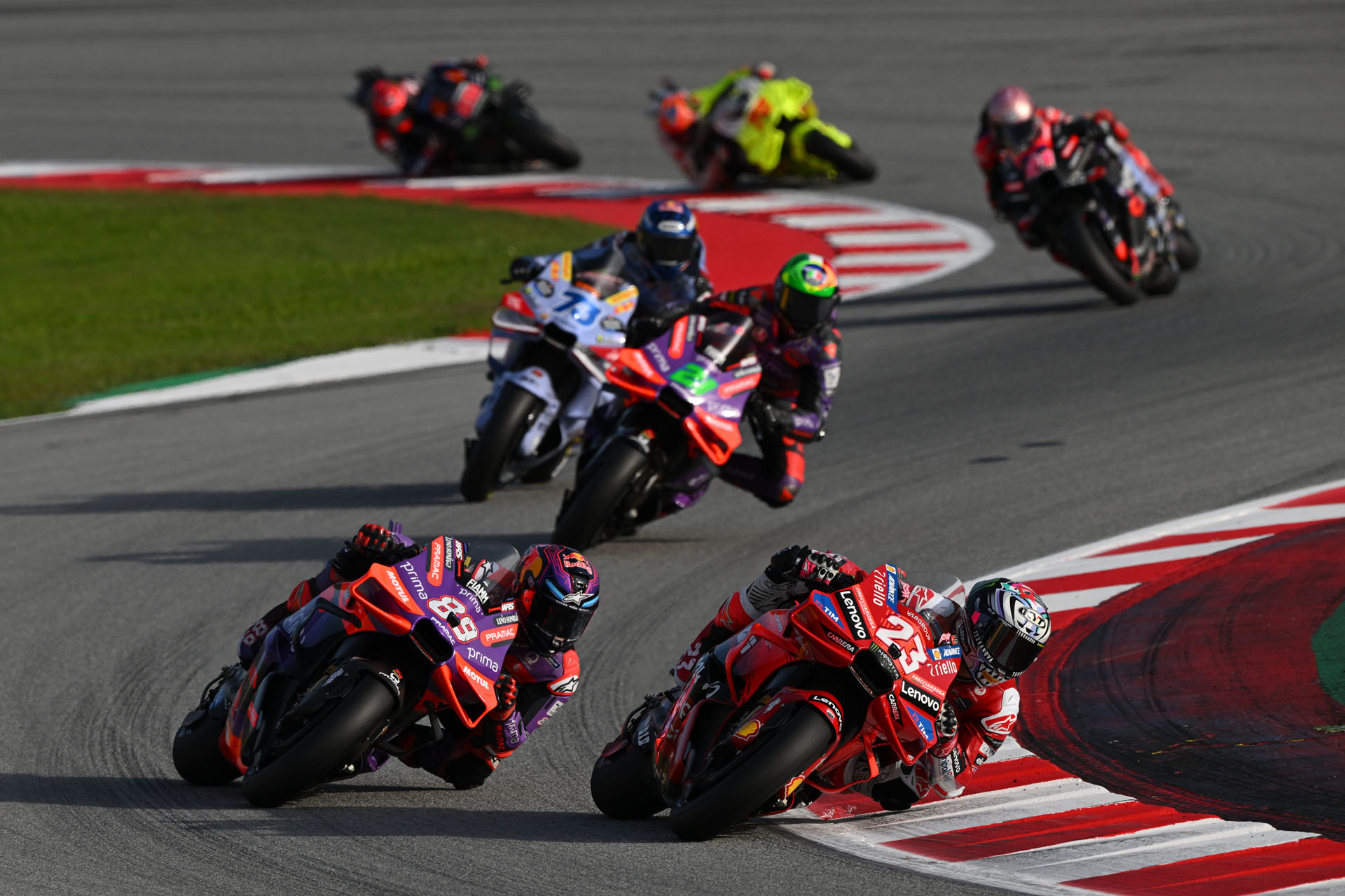 The two were then locked together for another lap before Martin hit back, finding a few more millimetres to really push both to the edge. With that, the momentum behind for Franco Morbidelli (Prima Pramac Racing) and Alex Marquez (Gresini Racing MotoGP) got them involved, but Martin was just clear and Bastianini shouldered his way back through to third. As you were.
