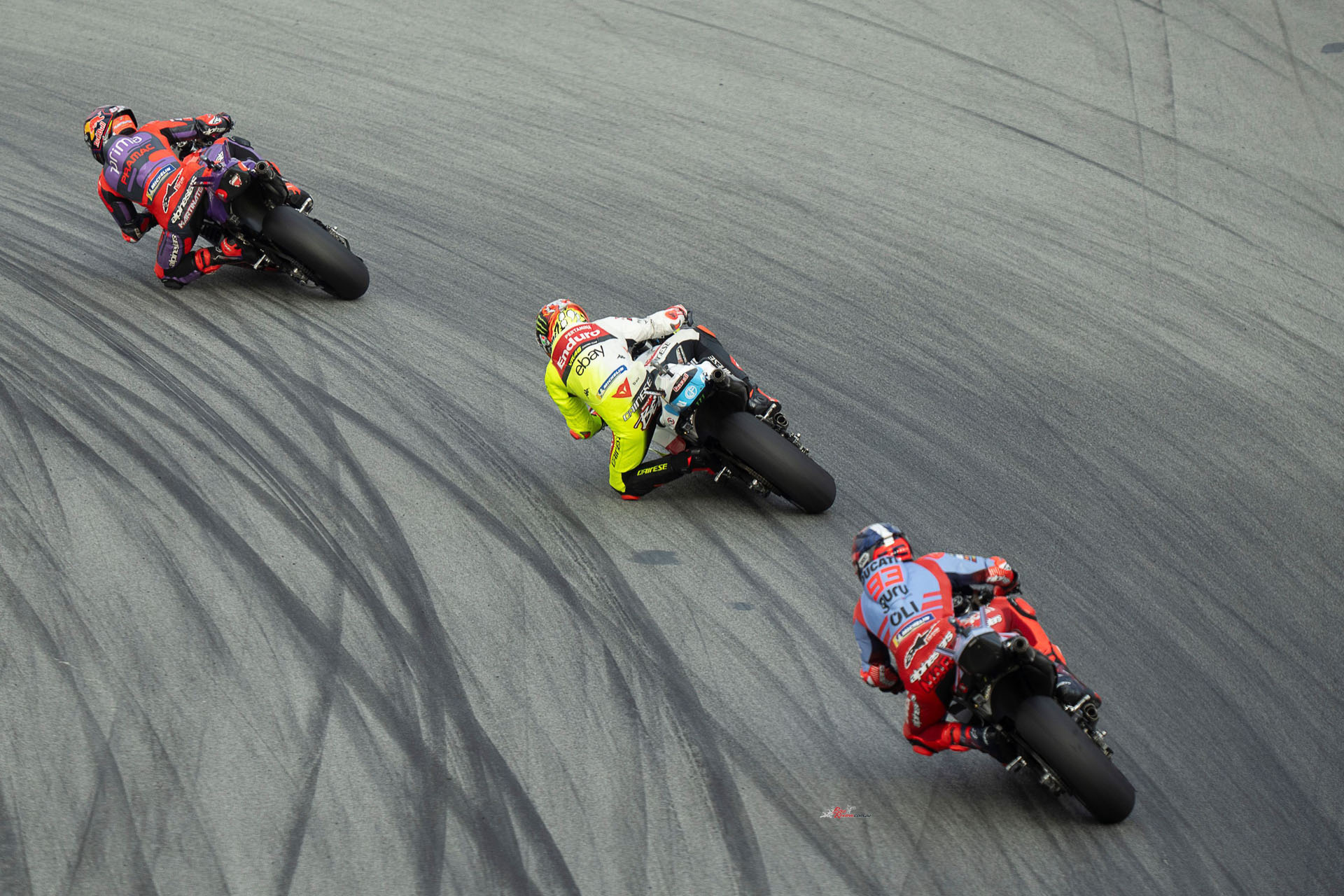 Revs up, lights out – it was a tight, tight run into the first corner, with it looking like Bagnaia was set for the holeshot before Martin made up the metres to move alongside – and then Bastianini sailed past both. But Bagnaia attacked back in the melee, grabbing the lead again round Turn 3.