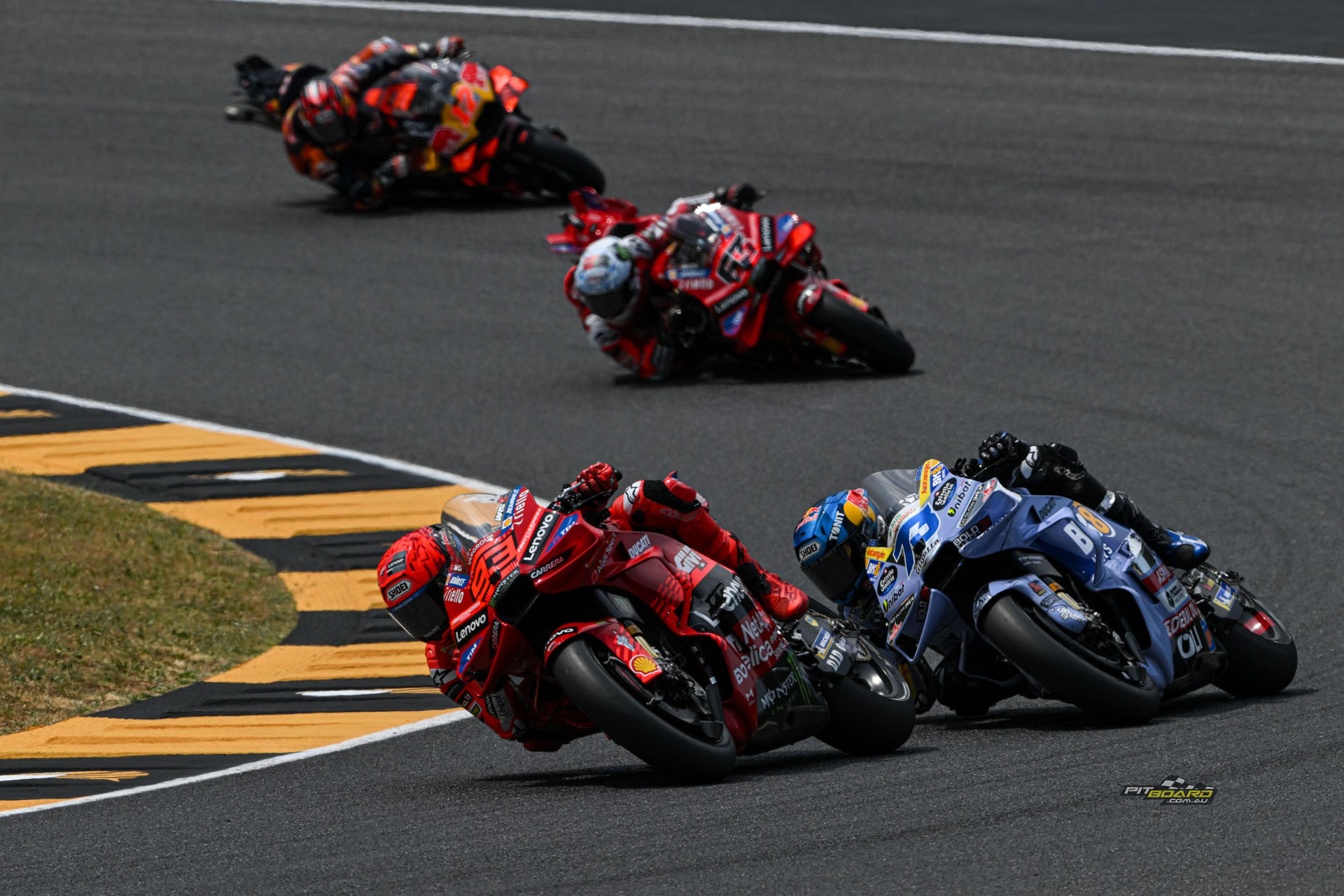 Lap 2, and it was absolutely head-to-head – the battle we all hoped for coming into 2025 burst into life. Marc Marquez hit the front again at Turn 1 and held position ahead of his teammate, who even had a look at Turn 6 but thought better of it. On Lap 3 it was Bagnaia’s turn to retaliate at Turn 1, but the #93 got under his teammate, only for the #63 to bash his way back into the lead for Turn 2. Marc Marquez barrelled back through two apexes later, but Pecco wasn’t done yet, aiming to turn it tight at Turn 5. But there, he kissed the rear end of the #93 Ducati ahead, allowing Alex Marquez through and dropping to P3.