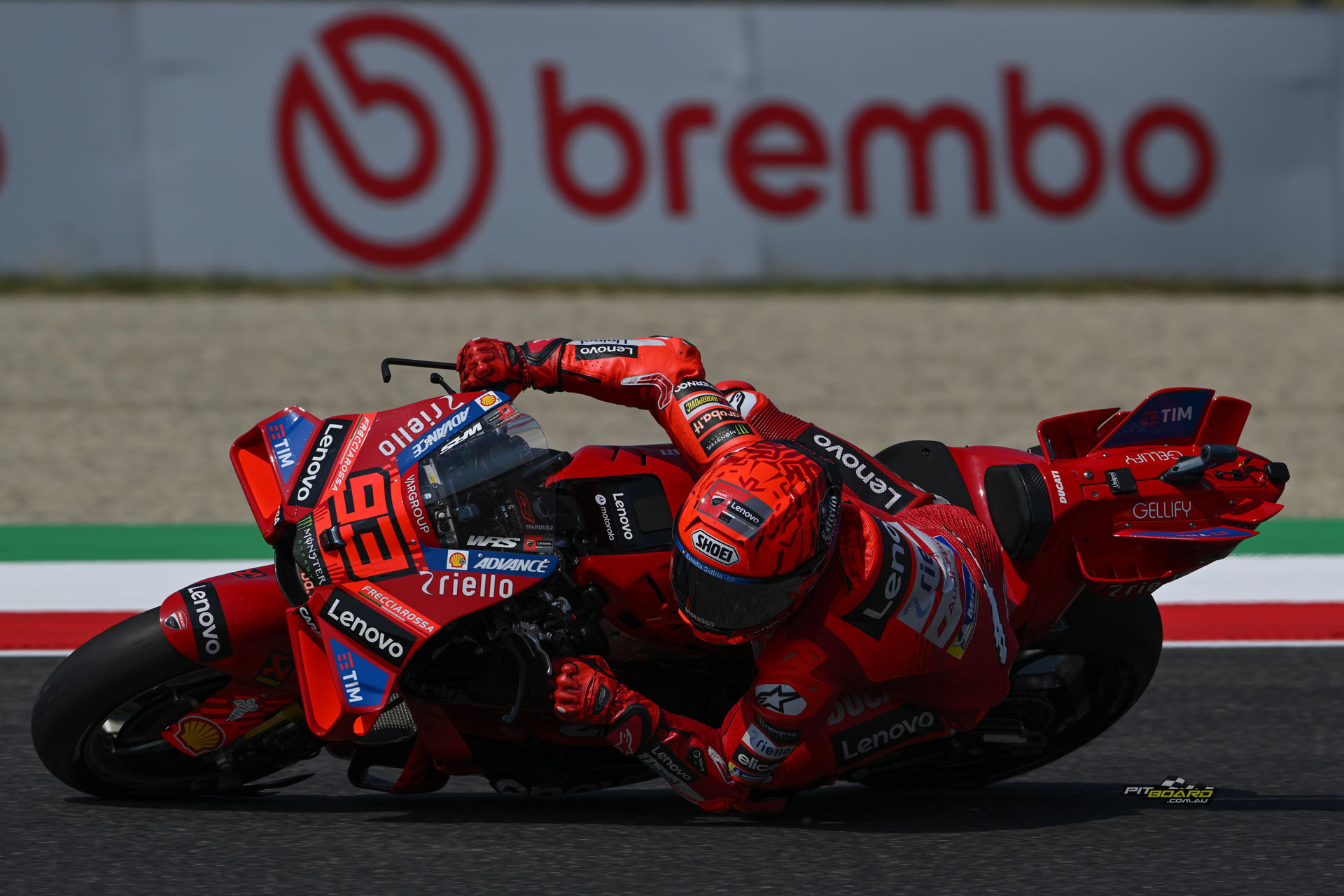 100 not out. Marc Marquez (Ducati Lenovo Team #93) has become the first rider ever to reach triple figures and take 100 pole positions across all classes after narrowly beating teammate Francesco Bagnaia to a Saturday morning P1 at the Brembo Grand Prix of Italy. Marquez’s all-time lap record, a 1:44.169, was just 0.059s quicker than Bagnaia’s best effort, as Alex Marquez (BK8 Gresini Racing MotoGP #73) claimed a front-row start having got within a tenth of pole in a memorable Mugello Q2.