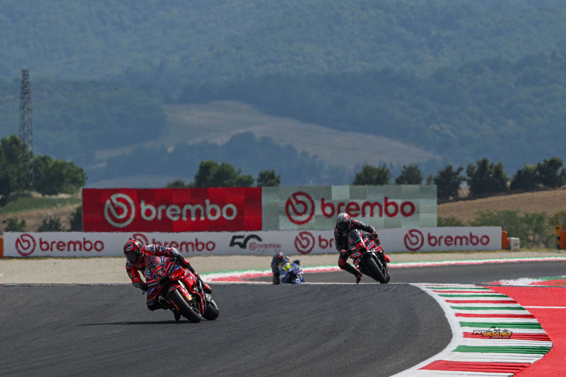 Lap 2 was a real corker as Marc, now already back into P3, was alongside brother Alex and teammate Pecco into Turn 1, three abreast as they fought for the lead. The #93 initially hit the front but ran himself and his brother Alex wide as Mugello specialist Bagnaia had the inside for the exit. Getting their elbows out, the #63 and #73 went head-to-head into Turn 2, with the Gresini Racing Ducati coming out on top. Pecco was pushed back further at Turn 4 with Marc coming by, reasserting his authority in the factory colours.
