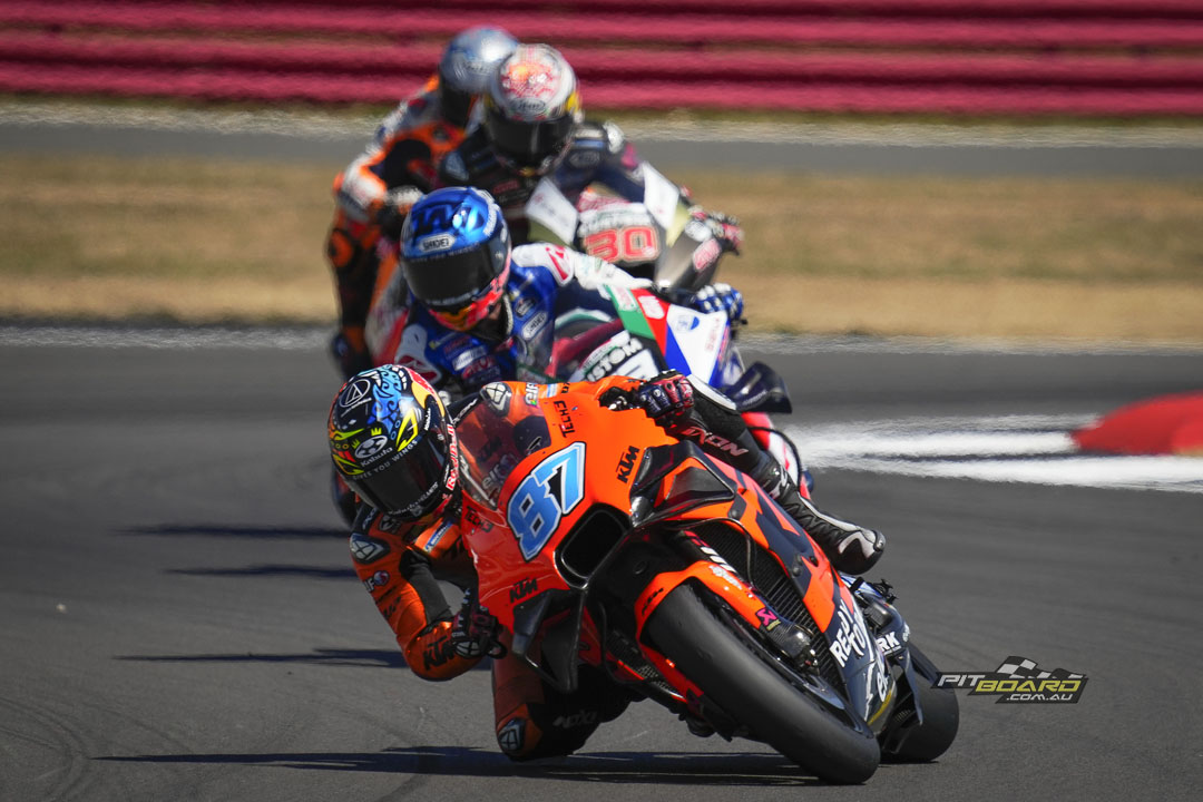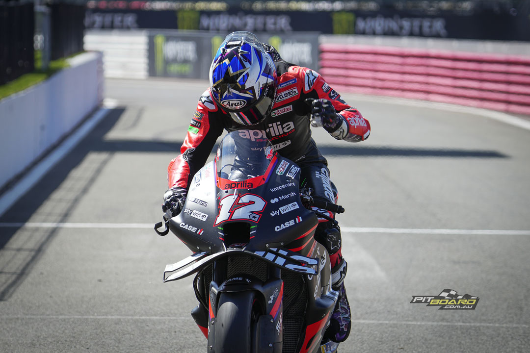 Behind them came the top two in the World Championship, Quartararo and Espargaro, who found themselves in direct combat for eighth on the final lap. Espargaro outbraked Quartararo at Brooklands and while he could not pull up in time to complete the pass, ninth was still a heroic effort for the Aprilia rider who feared he might not even be able to race after his practice highside. Losing just a point to Quartararo was probably his wildest dream on Saturday evening.