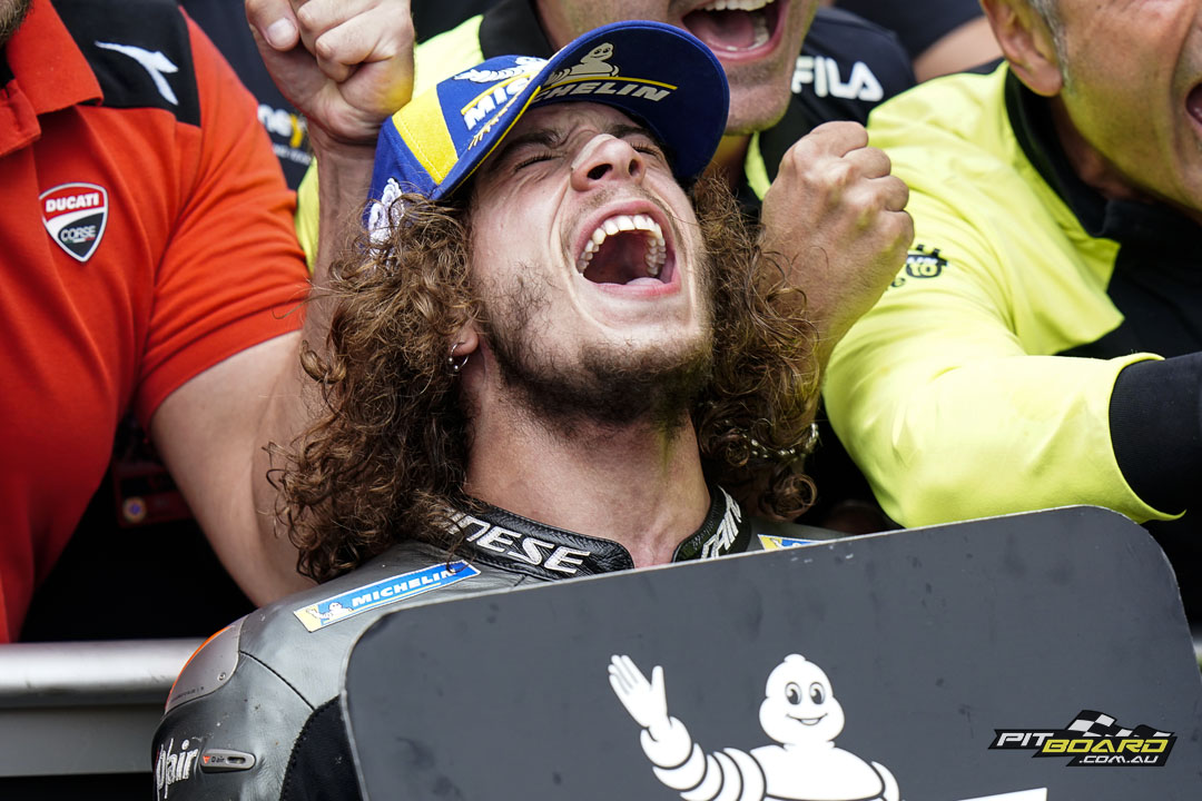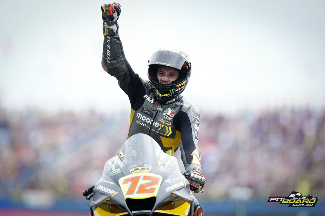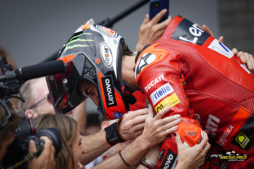 Up ahead and free of all the mayhem, however, Bagnaia cruised to victory. He eased off at the end, with the winning margin officially only 0.444 seconds after 26 remarkable laps, but it never seriously looked in doubt. Bezzecchi sent the VR46 team into raptures with his first premier class podium, and Viñales was less than a second further back in third after escaping the clutches of Miller.