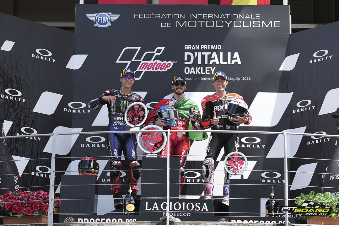 Pecco is back on top! In another classic 63 vs 20, Francesco Bagnaia (Ducati Lenovo Team) was back to his flawless winning ways at the front of the field in the Gran Premio d’Italia Oakley, bouncing back in style from a crash out in France. Fabio Quartararo (Monster Energy Yamaha MotoGP™) nevertheless gave it everything he had, stalking the Ducati rider for the majority of the race after the two picked their way to the front. In taking second, ‘El Diablo’ also extends his lead in the Championship.