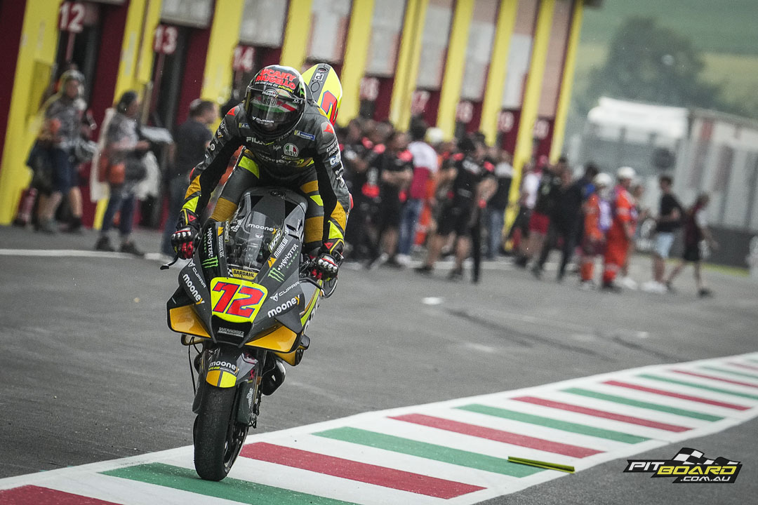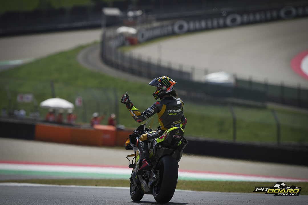 Ducati had swept the top five in qualifying but, rather than the slightly more accustomed Bagnaia being on the front row, it was rookie Fabio Di Giannantonio (Gresini Racing MotoGP™) starting from pole, fellow rookie Marco Bezzecchi sitting second and Mooney VR46 Racing teammate Luca Marini alongside. Di Giannantonio made a good launch and emerged with the lead from San Donato despite an attack from the VR46 duo, but Marini got past as they turned into Materassi as Bezzecchi slotted into third at the start of the 23 laps that lay ahead.