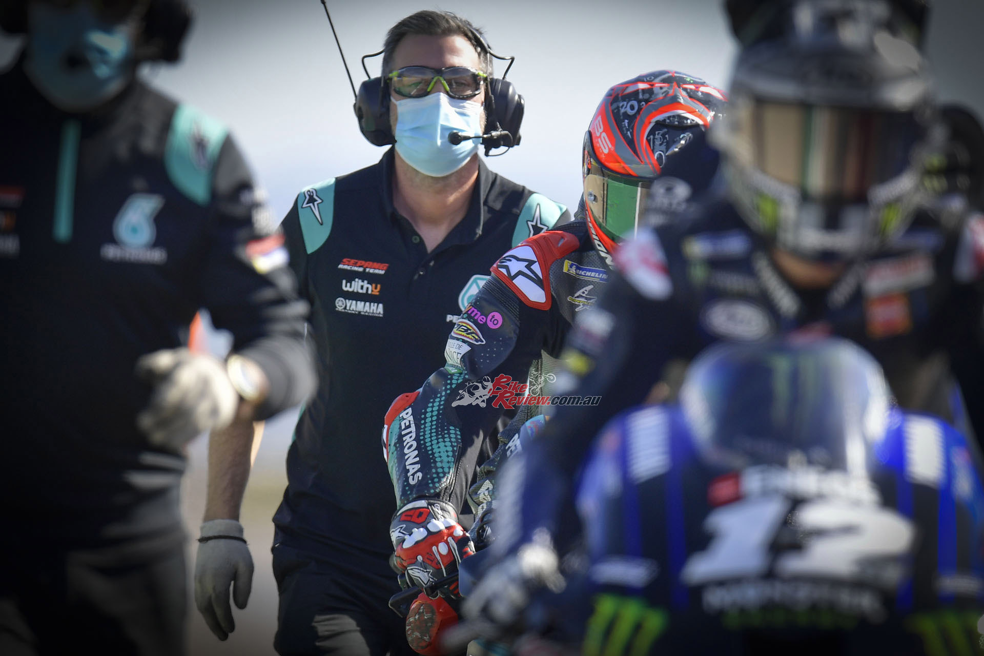 On his next lap, Quartararo made good on his earlier threat and did demote Aleix Espargaro to P2, with Quartararo’s fellow Monster Energy Yamaha MotoGP rider Maverick Viñales taking over in P3. Johann Zarco (Pramac Racing) and Valentino Rossi (Petronas Yamaha SRT) were next to climb the ladder into P5 and P6, with rookies Enea Bastianini (Esponsorama Racing) and then Jorge Martin (Pramac Racing) enjoying some time in the top 10 too.