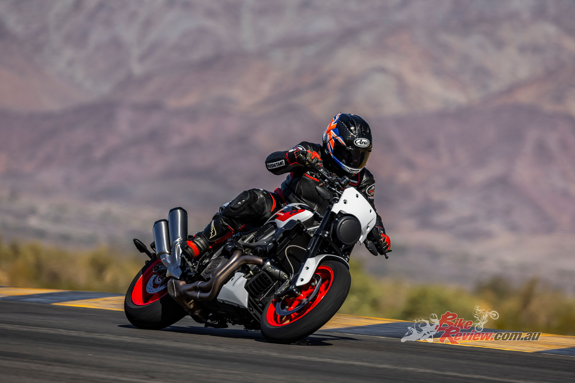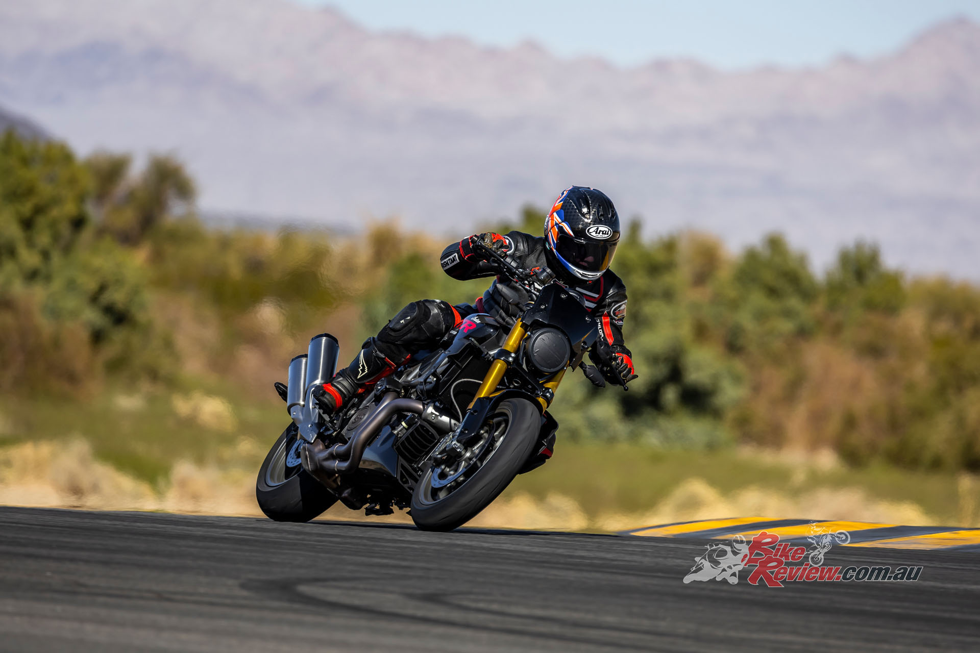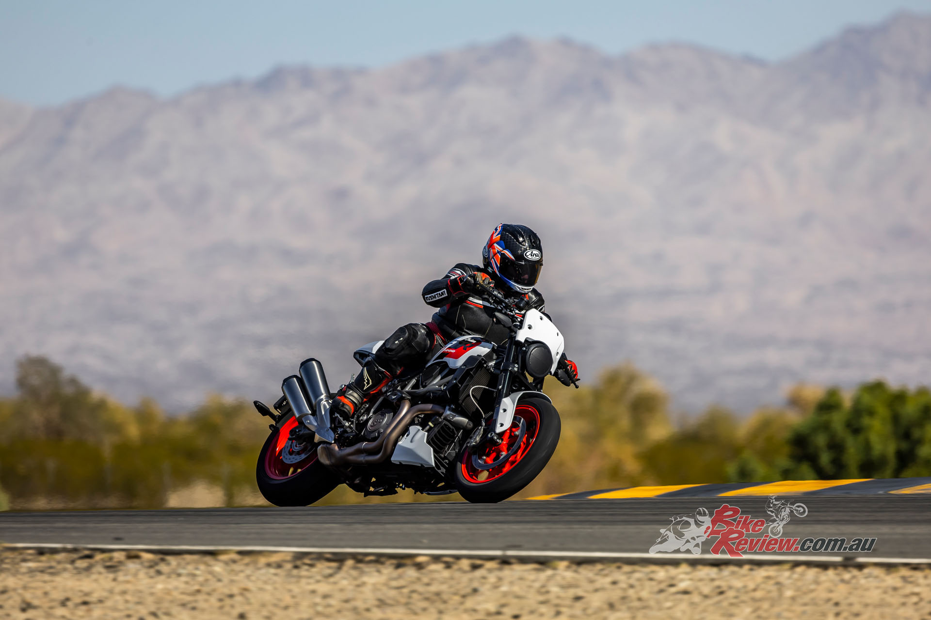 Keeping it revving that high was easily done via the stock six-speed gearbox whose ratios suit the bike well – although the two-way IRC race-pattern powershifter was a disappointment, with a harsh change that needed refinement, plus the actual lever itself had a sort of kink in it which prevented me getting at the pedal, so I had to shift gear on the kink. Easily fixed if it were my bike, I’m sure. But compared to its street-legal cousin, the Hooligan racer had a much more vivid pickup from a closed throttle, sending the front wheel in the air exiting Chuckwalla’s slower turns in second gear – all accompanied by the raucous racket from that under-motor exhaust.