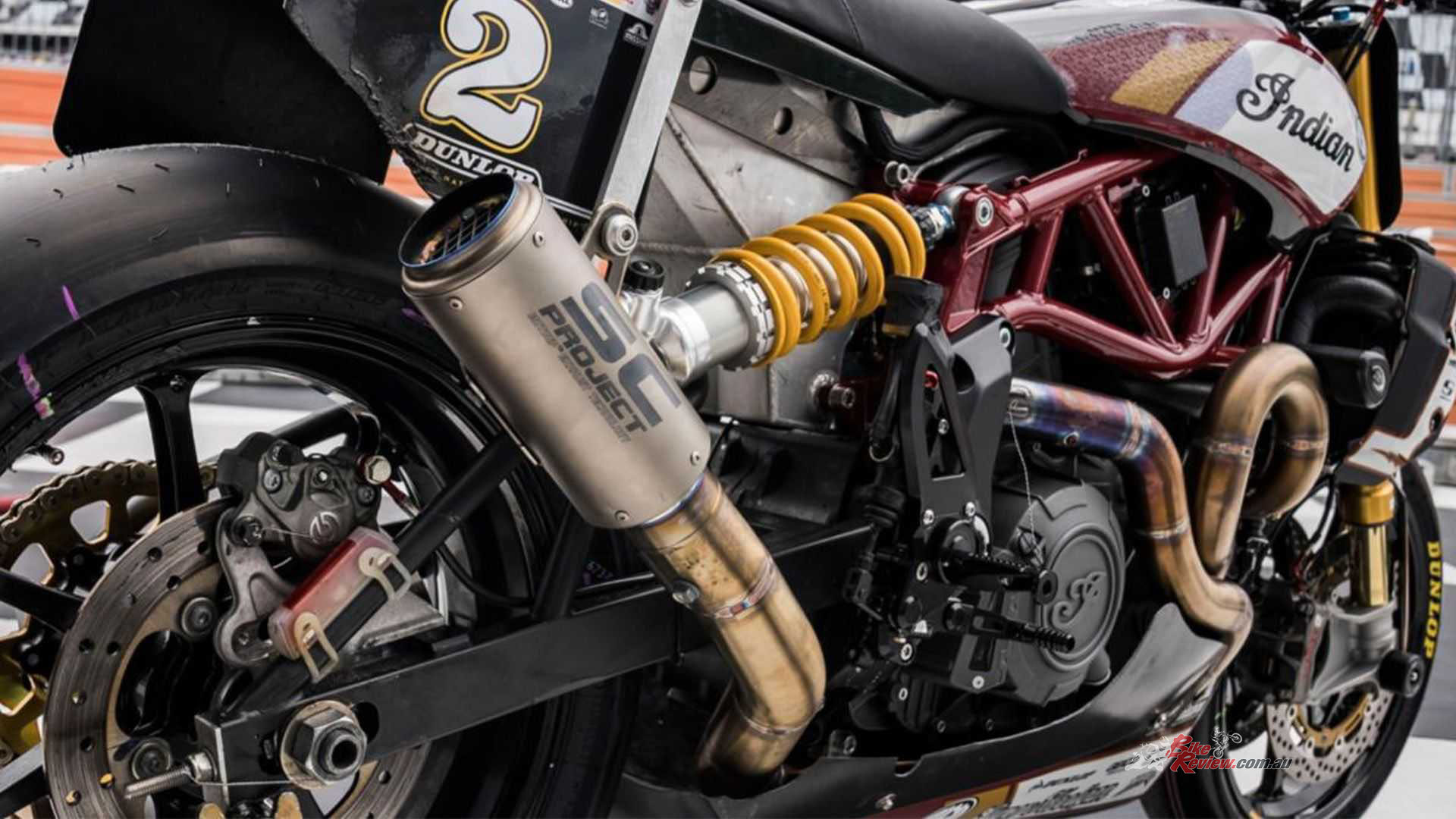 In compliance with SHNC rules, Indian has retained the stock FTR’s main frame and swingarm plates, but has fitted a 75mm shorter RSD-designed Trac Dynamics chrome-moly swingarm to reduce the wheelbase to 1450mm in pursuit of more agile handling. Coupled with the unchanged stock 25.7-degree head angle with a special set of triple-clamps delivering what bike-builder Roland Sands confirmed was 121mm of trail, that nimble yet stable steering was aided by the reduced rotational inertia and unsprung mass of the twin lightweight Dymag UP7X forged aluminium wheels which the Super Hooligan racer carries.