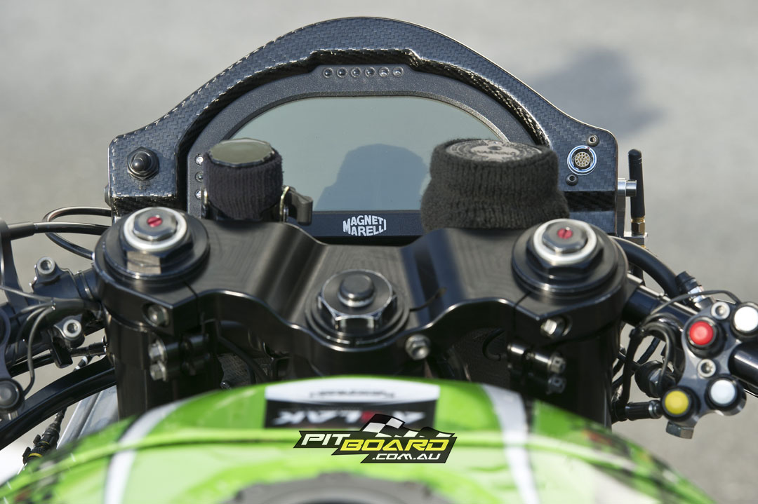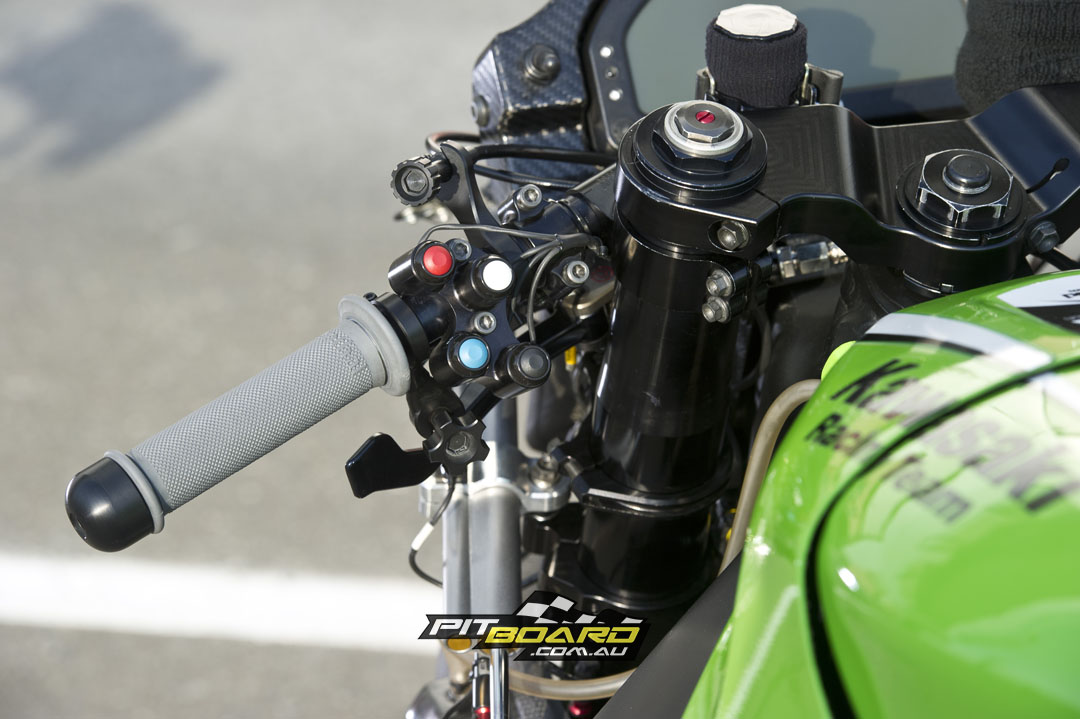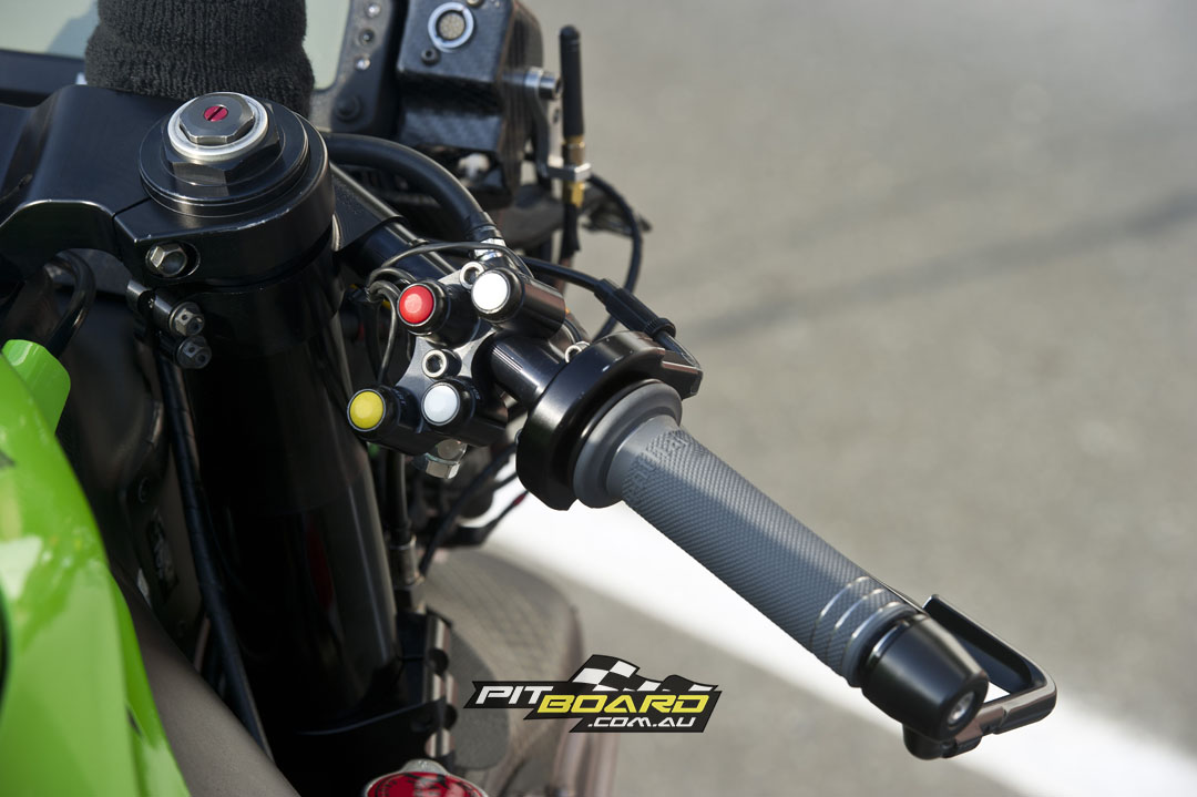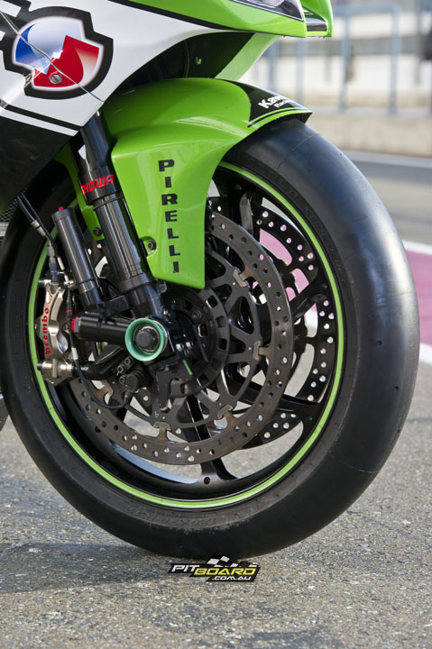 CHASSIS: Stock ZX-10R frame with bracing around the head stock and an insert for head angle changes. Swingarm pivot point adjustable, factory swingarm, carbon-fibre sub-frame, KHI rearsets, ‘bars, levers and controls, Showa factory suspension, Marchesini wheels, Brembo brakes, SpeedFiber carbon-fibre bodywork