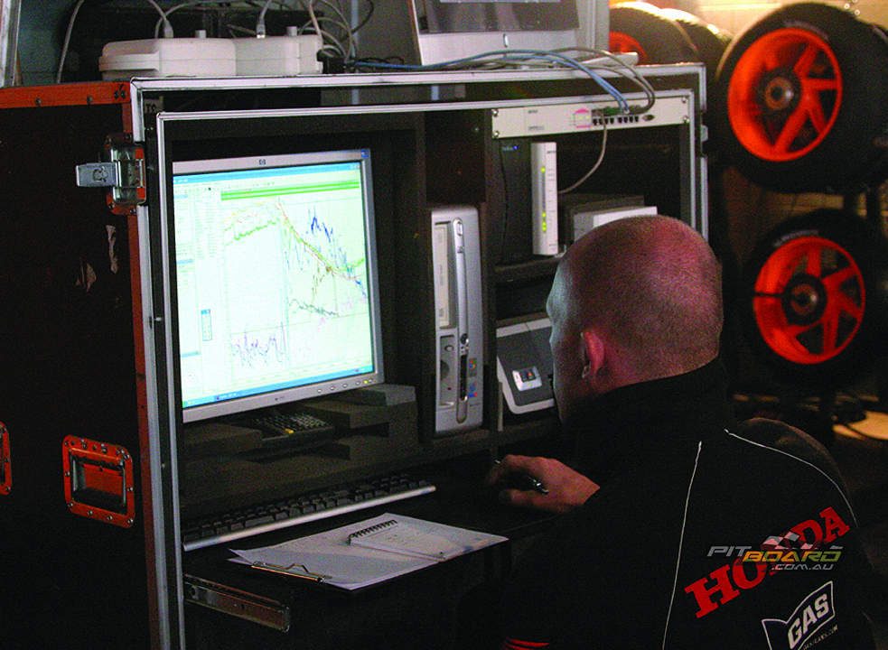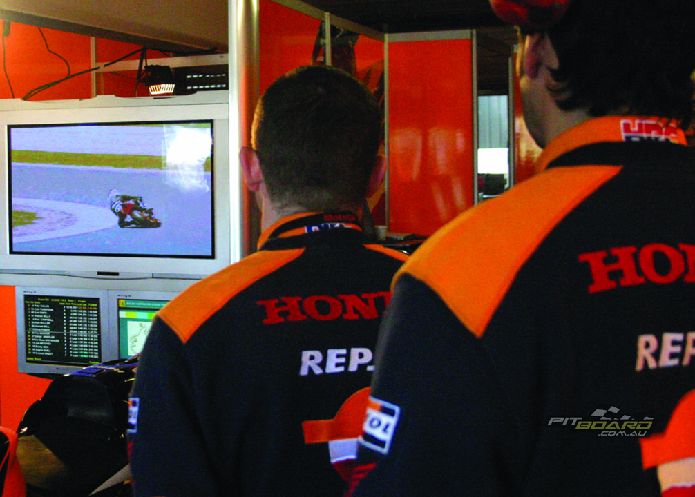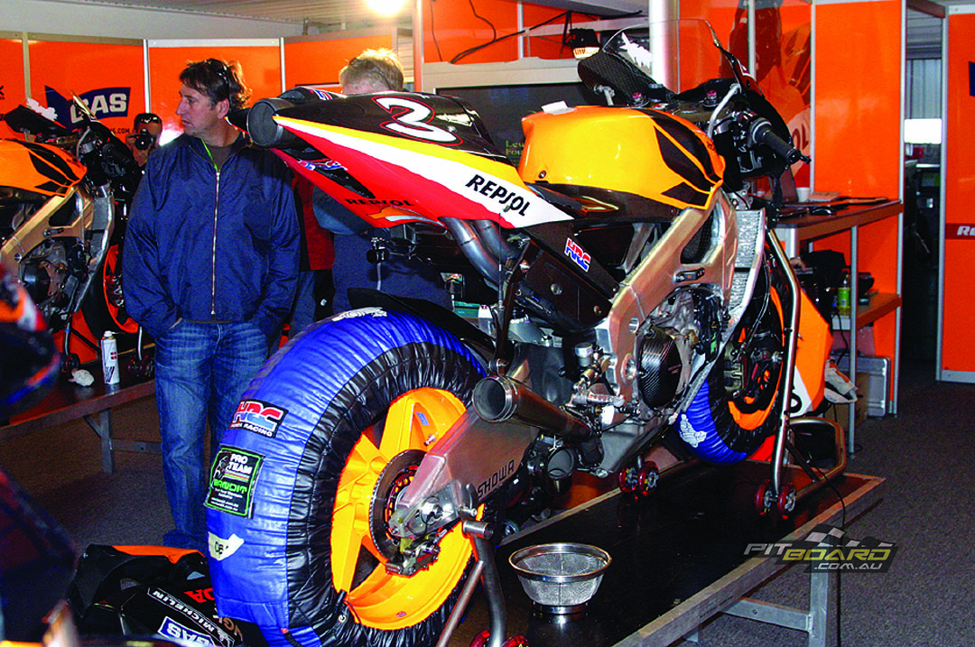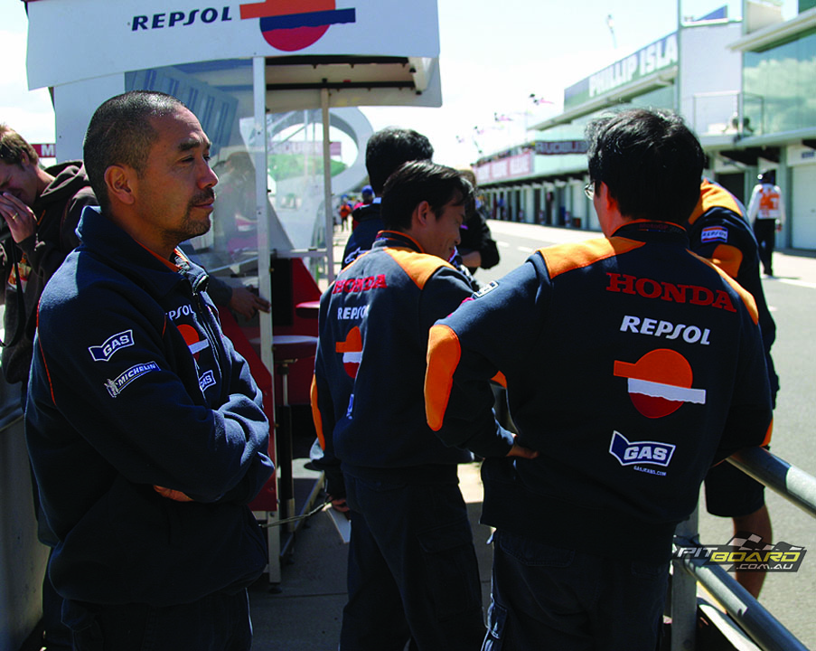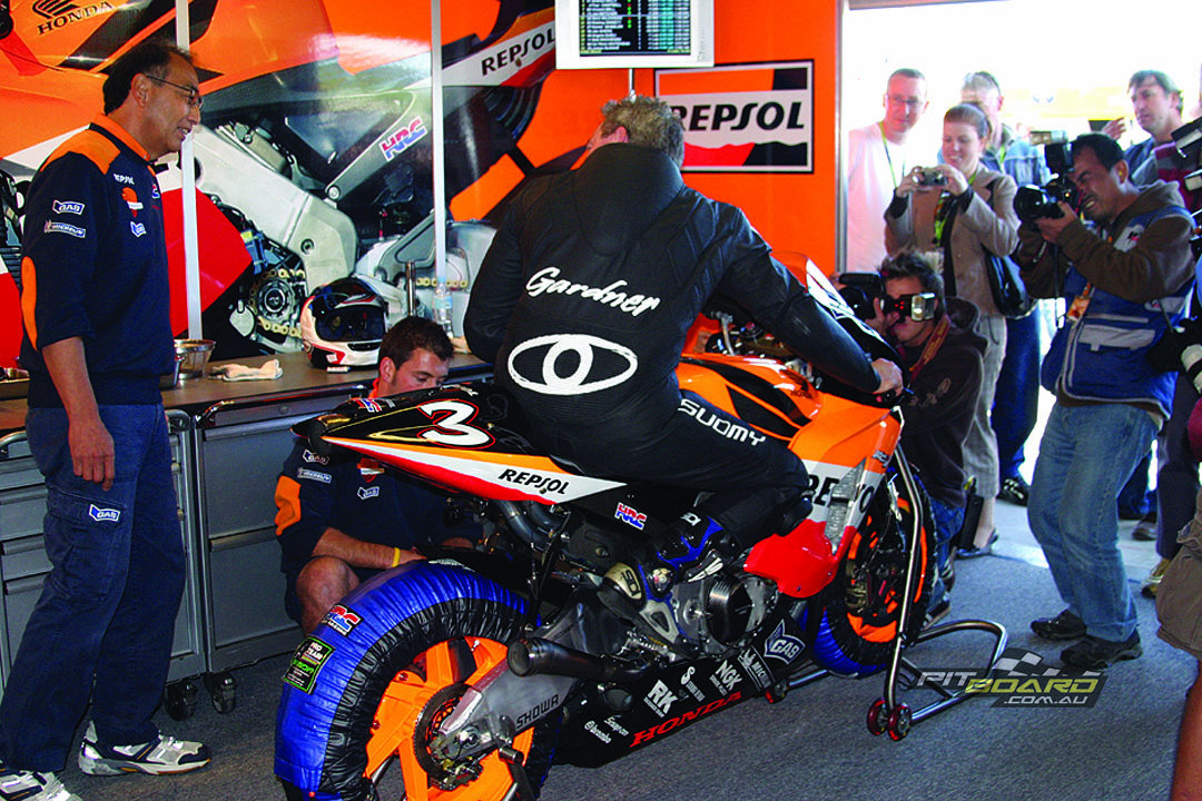 With 250-odd horsepower on tap and, err, a fair gap between rides, it was no surprise that the Repsol Honda garage began to stir and break into a group cold sweat as Gardner rolled out into pit lane and began his trip to the pit lane exit. All eyes turned to the monitor and Erv Kanemoto was at the front, joined by team manager Tanaka-San. Silence was followed by bursts of nervous laughter as Wayne wheelstood out of pit lane and onto the track…