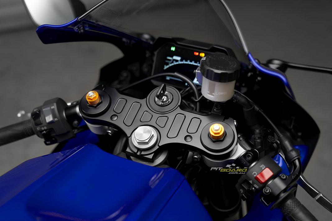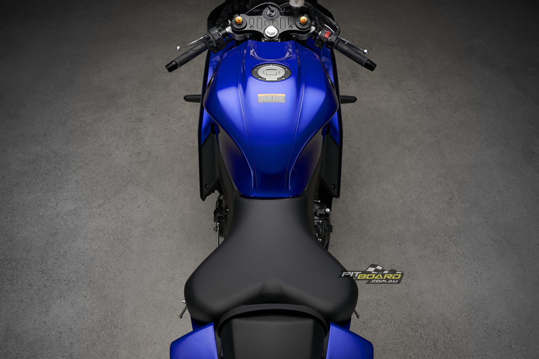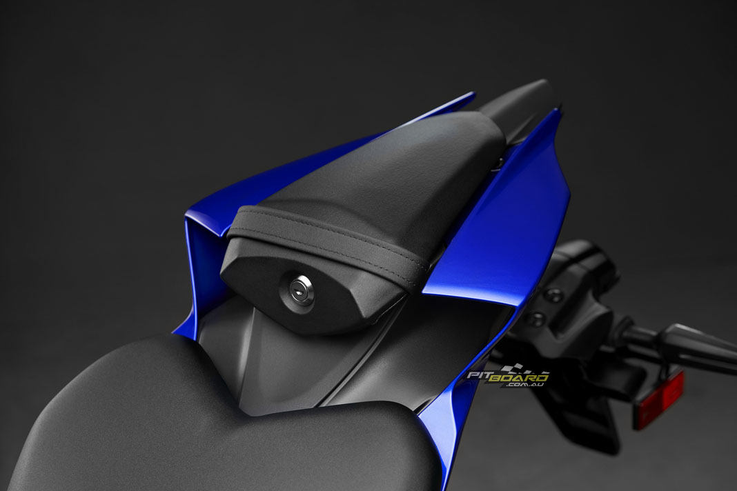 Yamaha say the comfortable new seat with material and cushioning used in the YZF-R1, combined with new low-profile fuel tank covers with deep knee pockets for optimal hip and knee positioning gives the rider freedom to move while also providing a firmly planted feel when leaned over. Separate clip-on handlebars are set in relation to the rider’s hips and footpeg positions for an aggressive position allowing the rider to naturally grip the machine with confidence, especially when tucking behind the windscreen on twisty roads or on the racetrack.