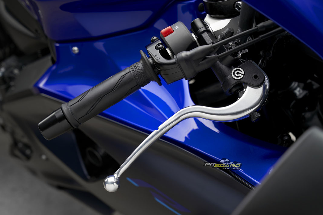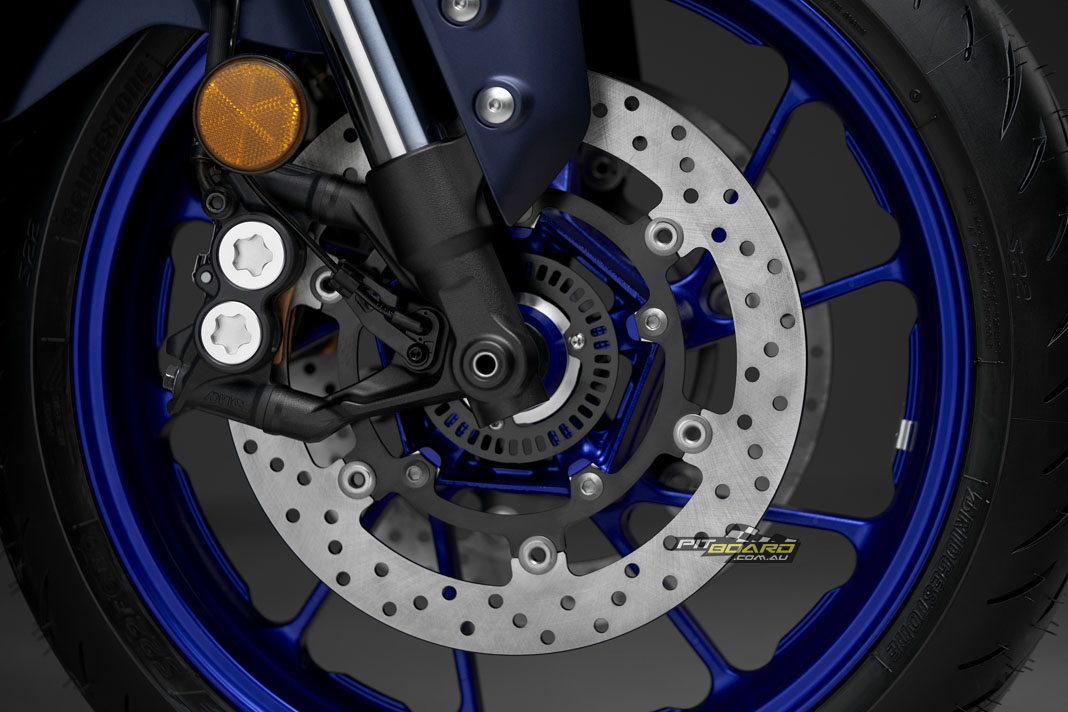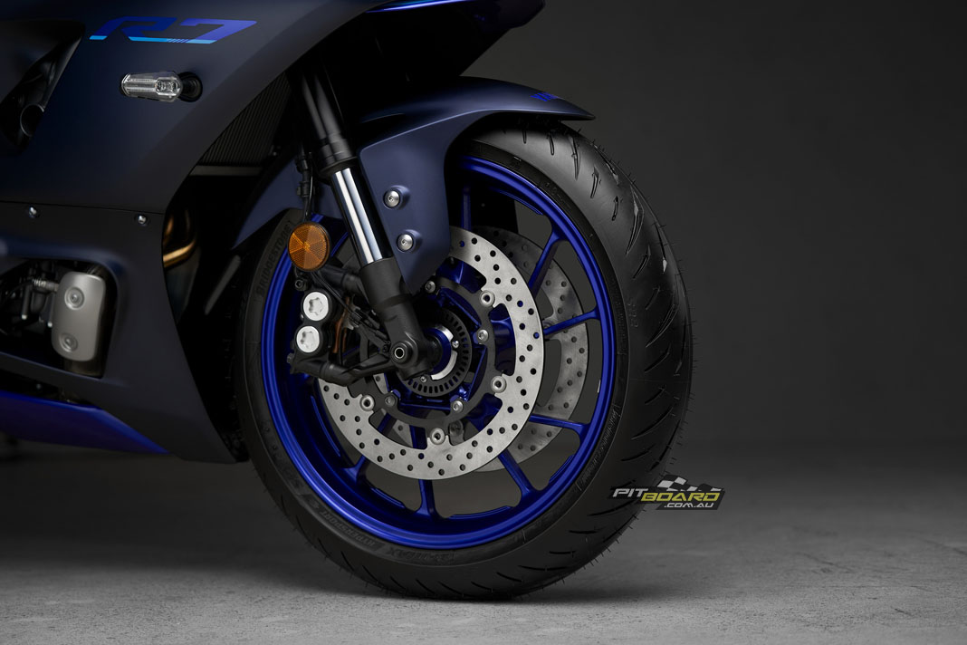The 2022 YZF-R7 is the first Yamaha model to feature a radial brake master-cylinder from Brembo. This new Brembo radial master-cylinder provides a more linear supply of hydraulic pressure to the radial mounted, four pot front brake calipers creating excellent controllability and stopping power through dual 298mm front brake rotors.