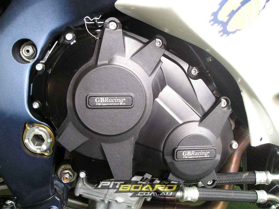 The majority of race series now require high strength engine case covers to be fitted, as modern OEM covers are very fragile, and also a shark fin rear sprocket guard to prevent “Daryl Beattie syndrome” (No toes). Damaging engine cases in a crash will almost definitely result in a serious amount of oil on the track, which is dangerous for other competitors and creates a lot of clean up work for the marshals. Kits are available from Vortex, GB Racing, Woodcraft, Yoshimura and others ($250-$500) and while you are at it get some rear stand swingarm bobbins ($40-$80).