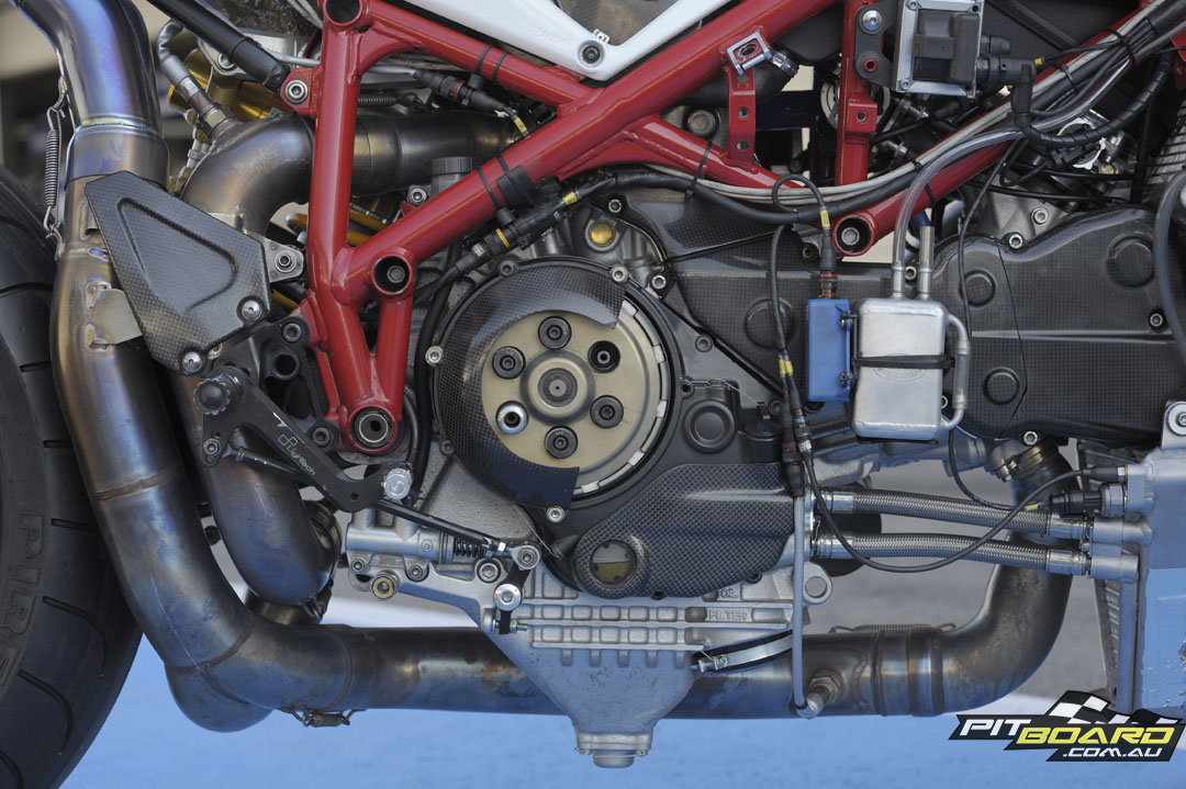 Transferring power is the dry slipper-clutch and the cartridge-style six-speed transmission from the Ducati race kit. The pinions from the gearbox are all shot-peened before fitting to lengthen their life.