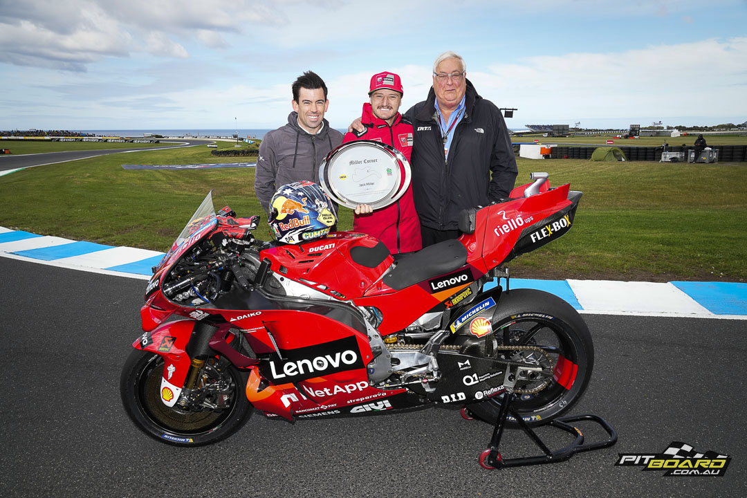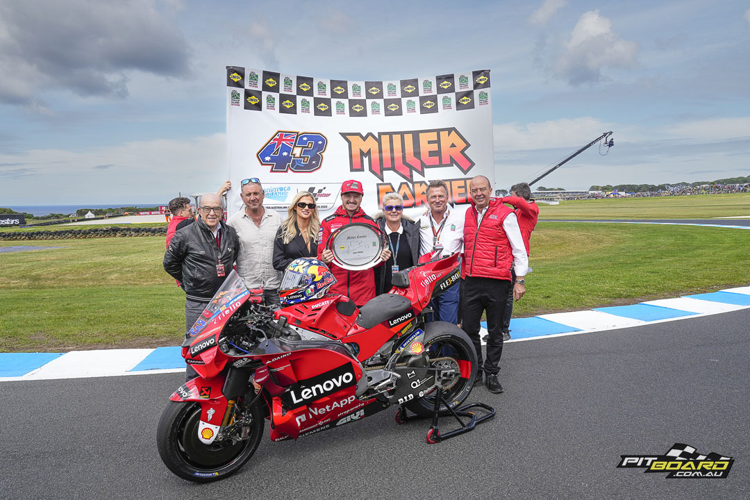 Dorna CEO Carmelo Ezpeleta, Dorna Chief Sporting Officer Carlos Ezpeleta and IRTA CEO Mike Trimby joined the ceremony to congratulate the Australian, and another home hero was on hand in MotoGP™ Legend Mick Doohan. Phillip Island Grand Prix Circuit owner Andrew Fox presented Miller with the plaque, alongside Australian Grand Prix Commission CEO Andrew Westacott.