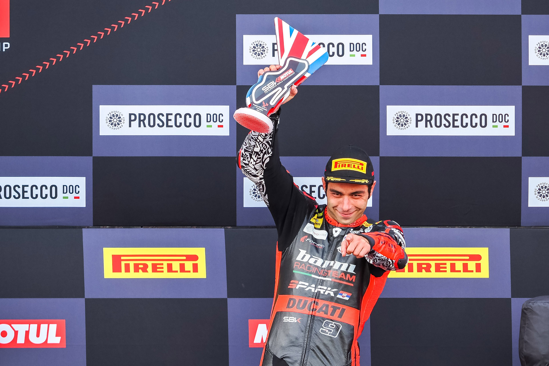 A crash at Turn 11 on Lap 5 dropped him to tenth place but he soon fought his way back up. On Lap 7, he passed Niki Tuuli (Dynavolt Triumph) and Lucas Mahias (Kawasaki Puccetti Racing) at Turn 1 aggressively to move into seventh, before overtaking home hero Tom Booth-Amos (Motozoo ME AIR Racing) at Turn 11 on the same lap. On Lap 9, the FIM Stewards gave the Italian a Long Lap Penalty for irresponsible riding after he forced Mahias onto the grass on the exit of Turn 1, which he took a lap later before fighting his way back.