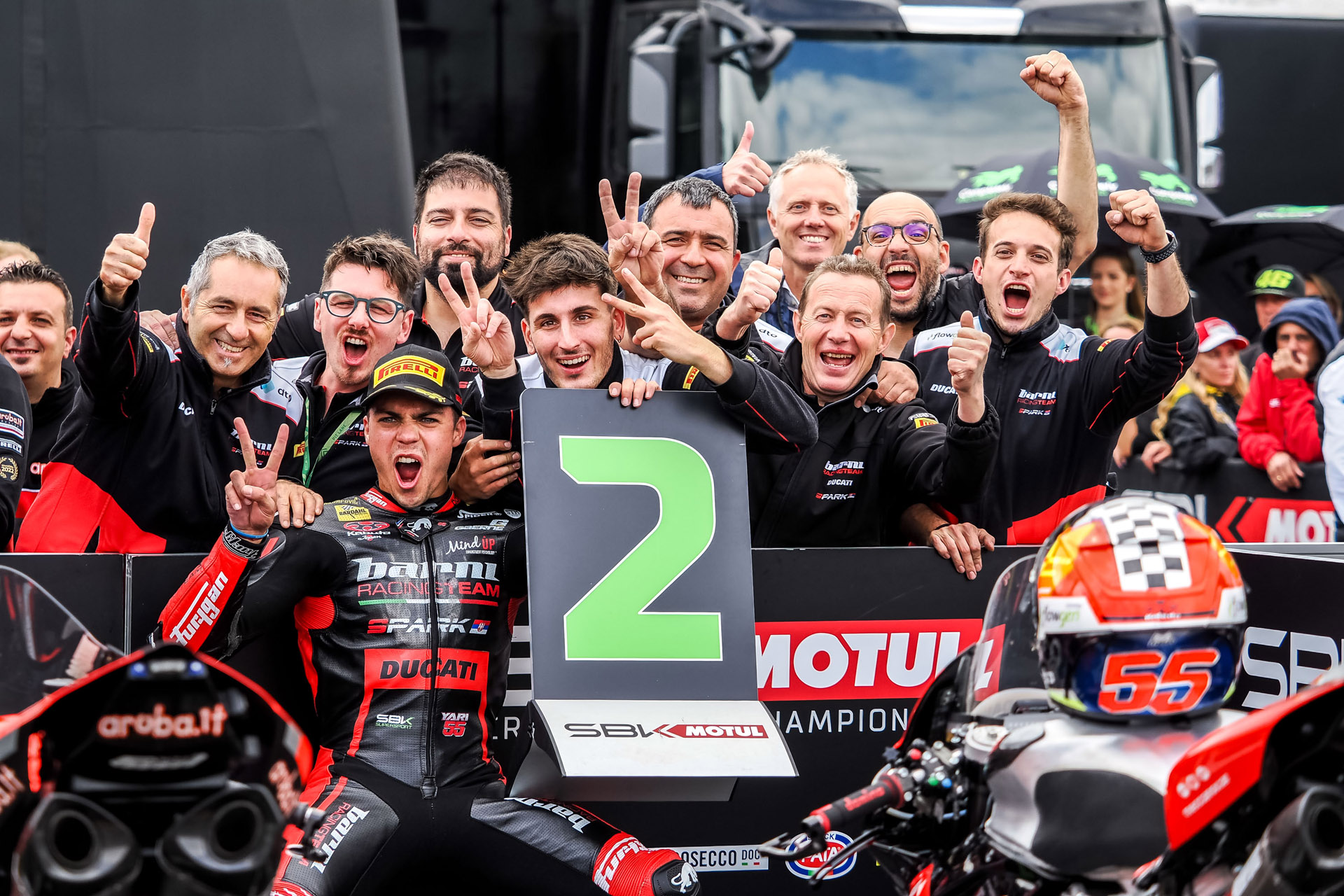 With Rea dropping back from the lead pair, the battle for the podium heated up. Rea was initially under pressure from teammate Alex Lowes but, as the race progressed, other riders were joining the party. Danilo Petrucci (Barni Spark Racing Team) started from the second row but his pace, like in Race 1, allowed him to fight for the podium as he did in Race 1. He moved into fifth place by passing Andrea Locatelli (Pata Yamaha Prometeon WorldSBK) on Lap 15 at Turn 11 before moving into fourth by overtaking Lowes at Turn 9 two laps later. The Italian rookie’s crucial move for the podium came on Lap 18 when he overtook Rea at Turn 4 before he pulled a gap to take his maiden WorldSBK rostrum and Barni Ducati’s first since Argentina 2018. He also became the 129th different rider to stand on the podium.