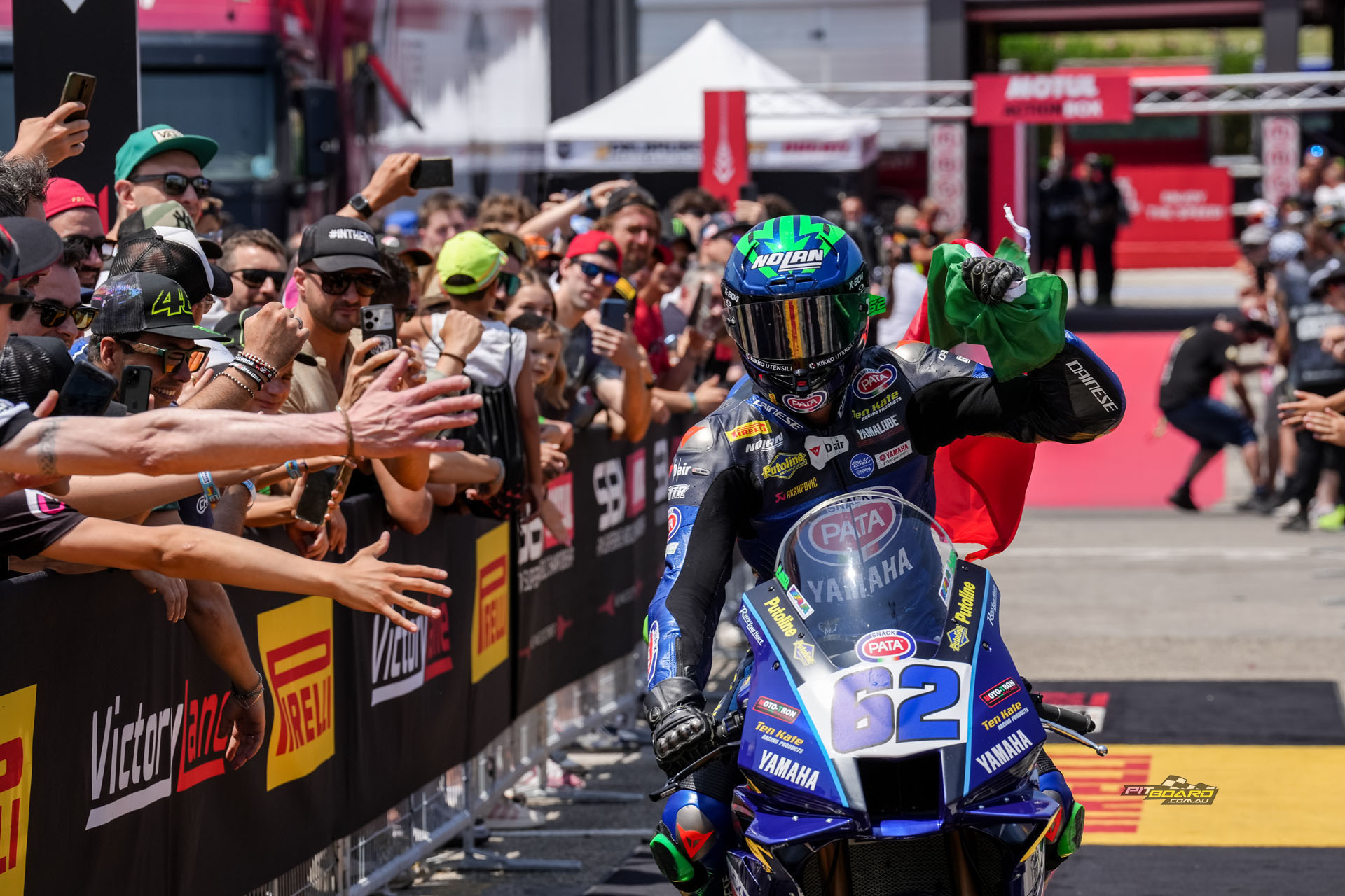 Andrea Locatelli (Pata Maxus Yamaha) won a protracted battle with Danilo Petrucci (Barni Spark Racing Team) (Barni Spark Racing Team) to claim P4. ‘Petrux’ and Alex Lowes (bimota by Kawasaki Racing Team) gave a sequel to their Race 1 battle for P3, a struggle which Petrucci won, but not without Locatelli, Bulega and Bautista passing the pair, shuffling the #9 to P5.