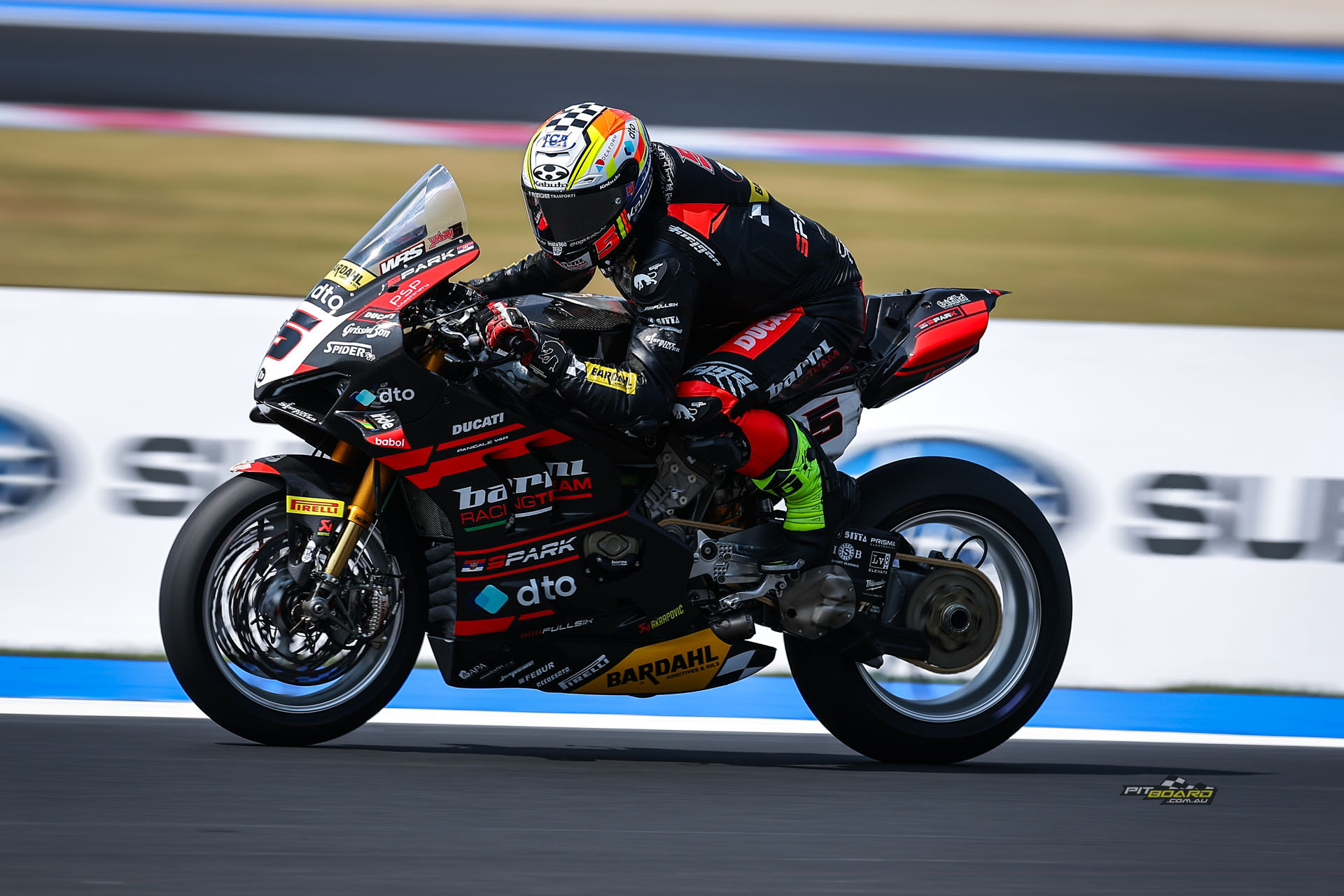 Nicolo Bulega (Aruba.it Racing – Ducati) and Axel Bassani (bimota by Kawasaki Racing Team) found themselves in the gravel just moments after lights out as Bulega surged up for the holeshot. Bassani lost control of his bike as he lost the front on the inside, and his KB998 Rimini slid into Bulega, ending the race for both of them, and ending a 50-race streak of at least one Ducati on the podium. The incident was investigated by the FIM WorldSBK Stewards, and Bassani was given a double Long Lap Penalty for Race 2 for irresponsible riding at Turn 1.