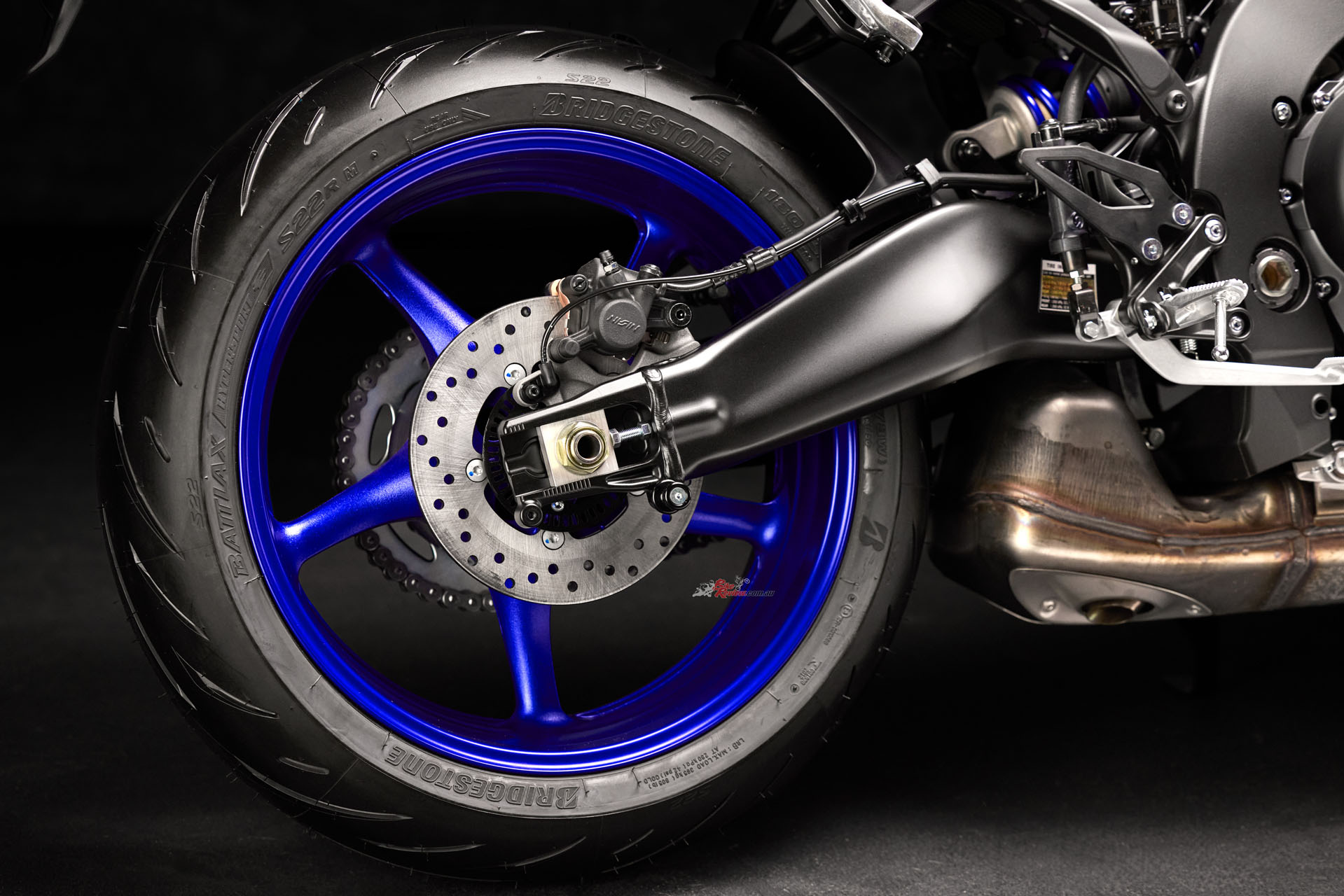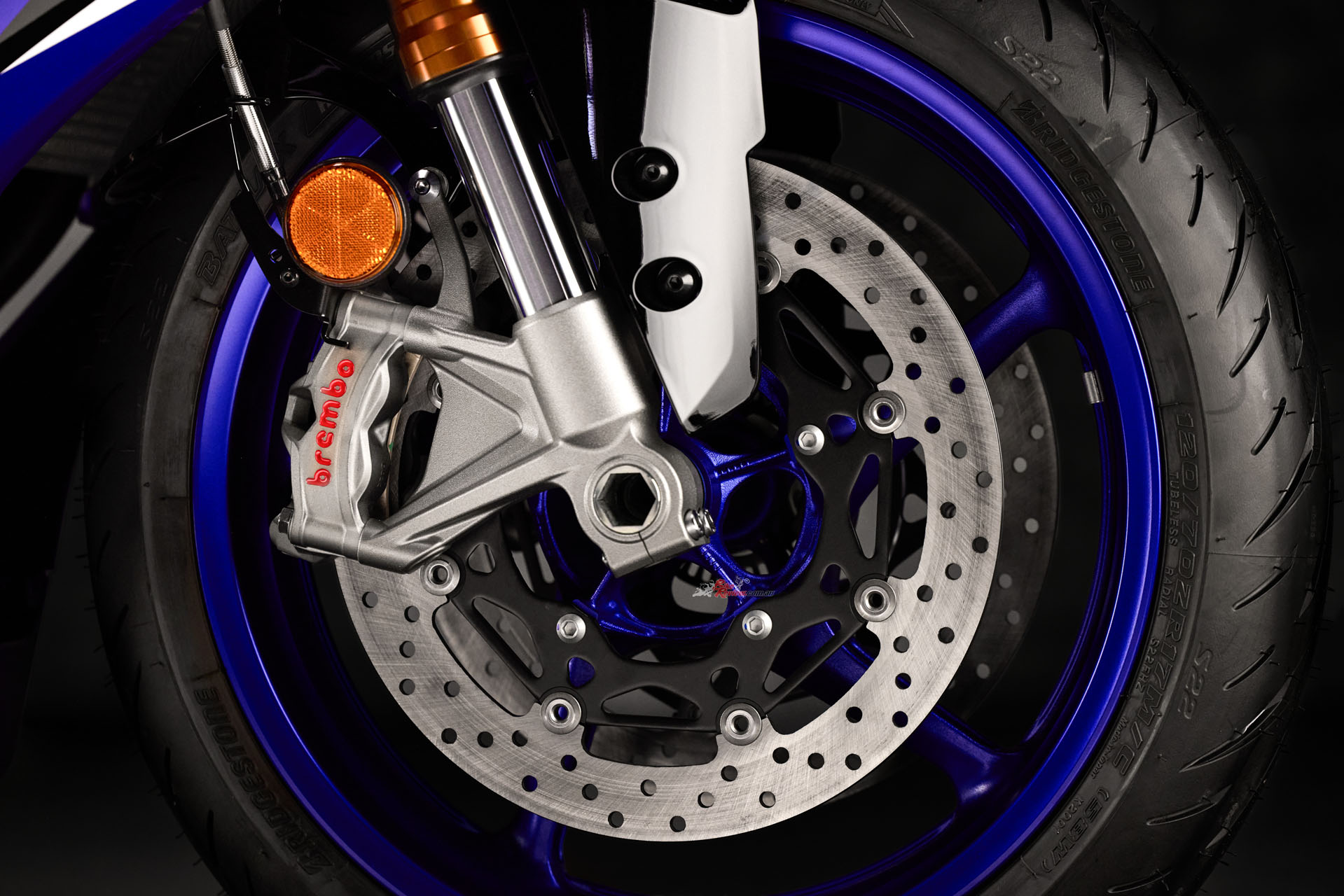 Premium Brembo Stylema monoblock front calipers combine with a Brembo radial master cylinder, large 320mm dual front discs, stainless steel brake lines and aggressive pad compounds to offer supersport-level braking with exceptional power and feel. YZF-R9 also offers the option to turn rear ABS off for track riding.
